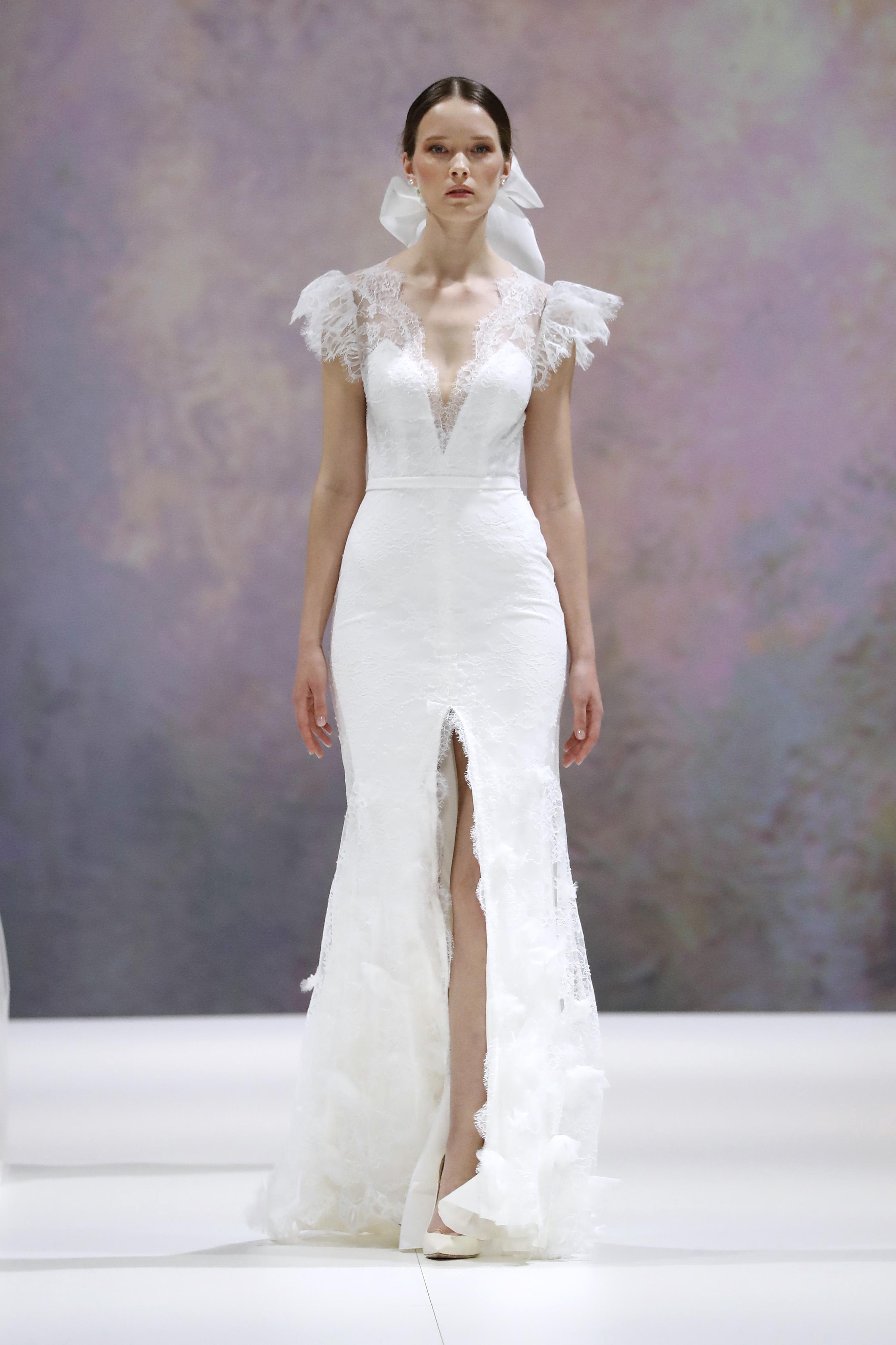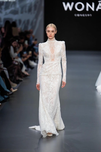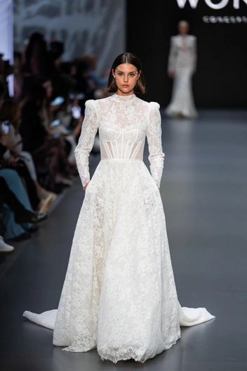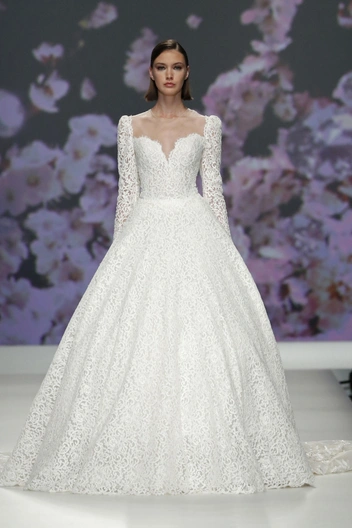 Кружевное свадебное платье в 2026 году переживает не ренессанс, а осознанный апгрейд: кружево становится более графичным, фактурным, иногда — почти архитектурным. Многие модели демонстрируют кружево дозированно — в виде верхнего слоя на прямом свадебном платье, в зоне лифа, рукавов или спинки.