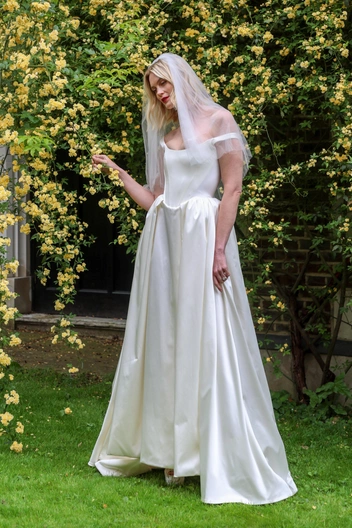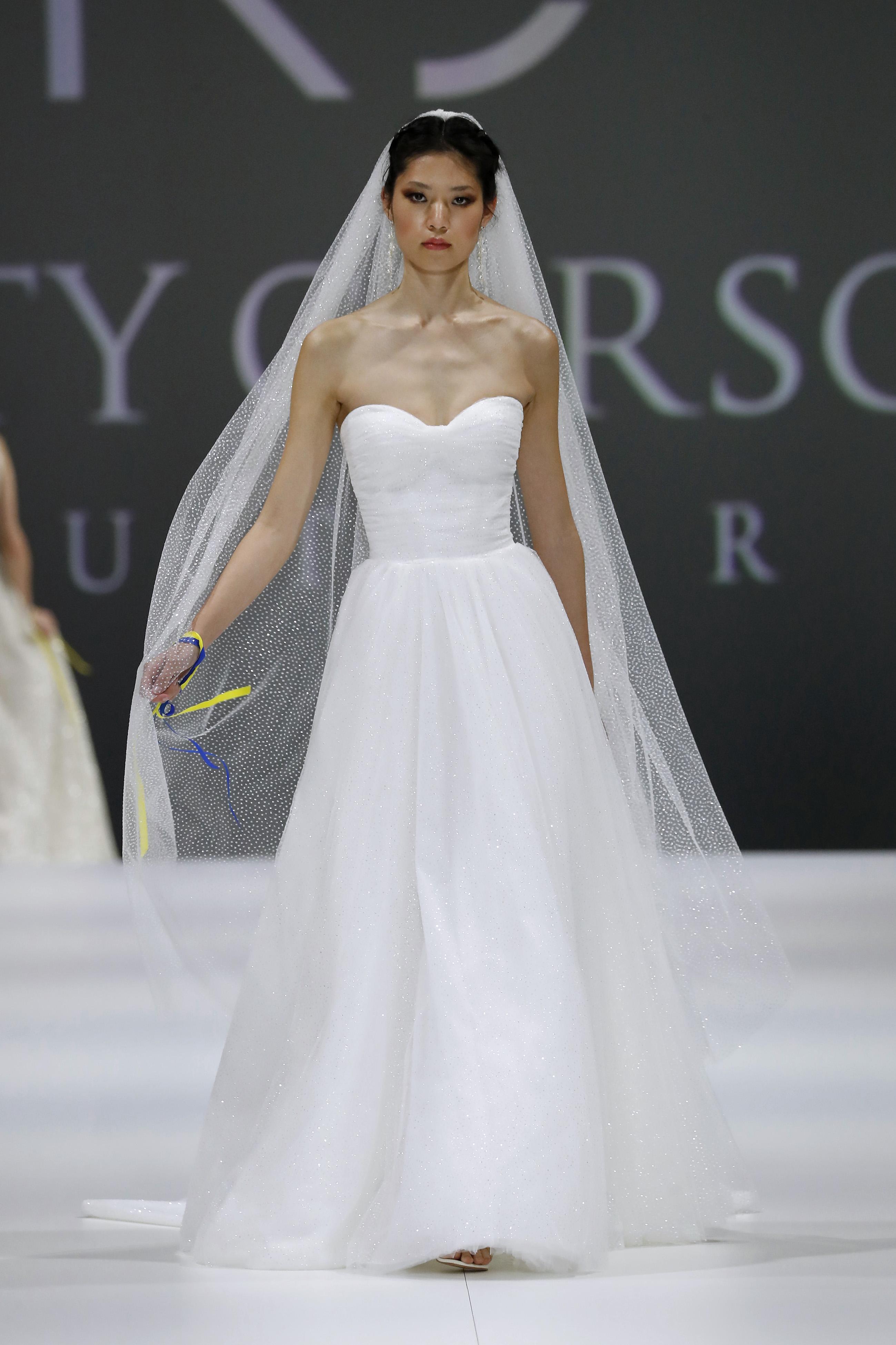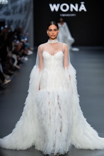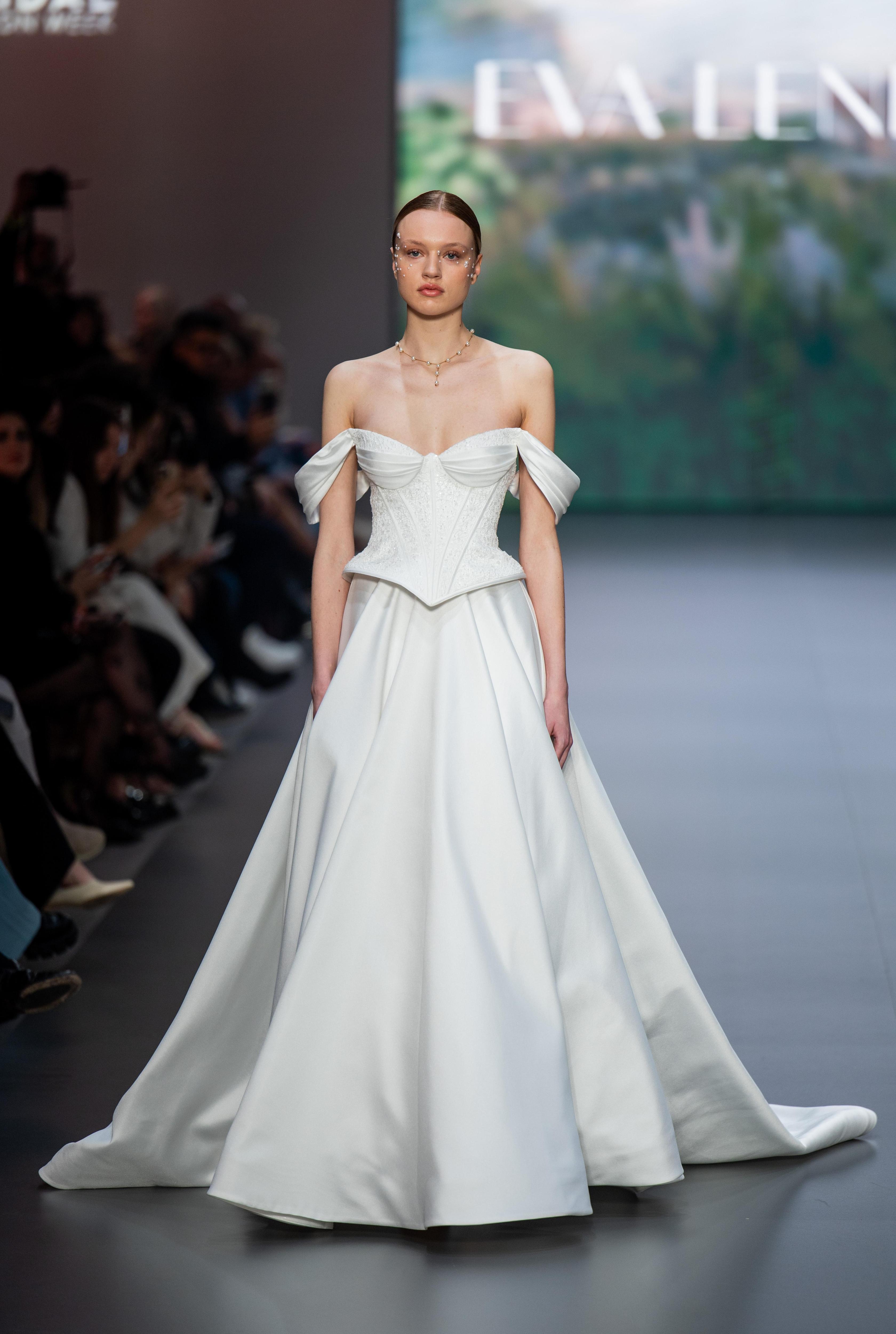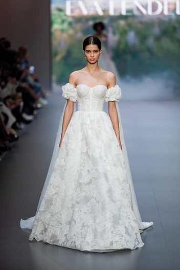 Опирается на привычные свадебные коды: белый или айвори, фата, пышная юбка или годе, корсетный верх и вневременной силуэт, который будет смотреться актуально и через десять лет.