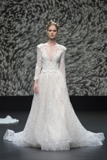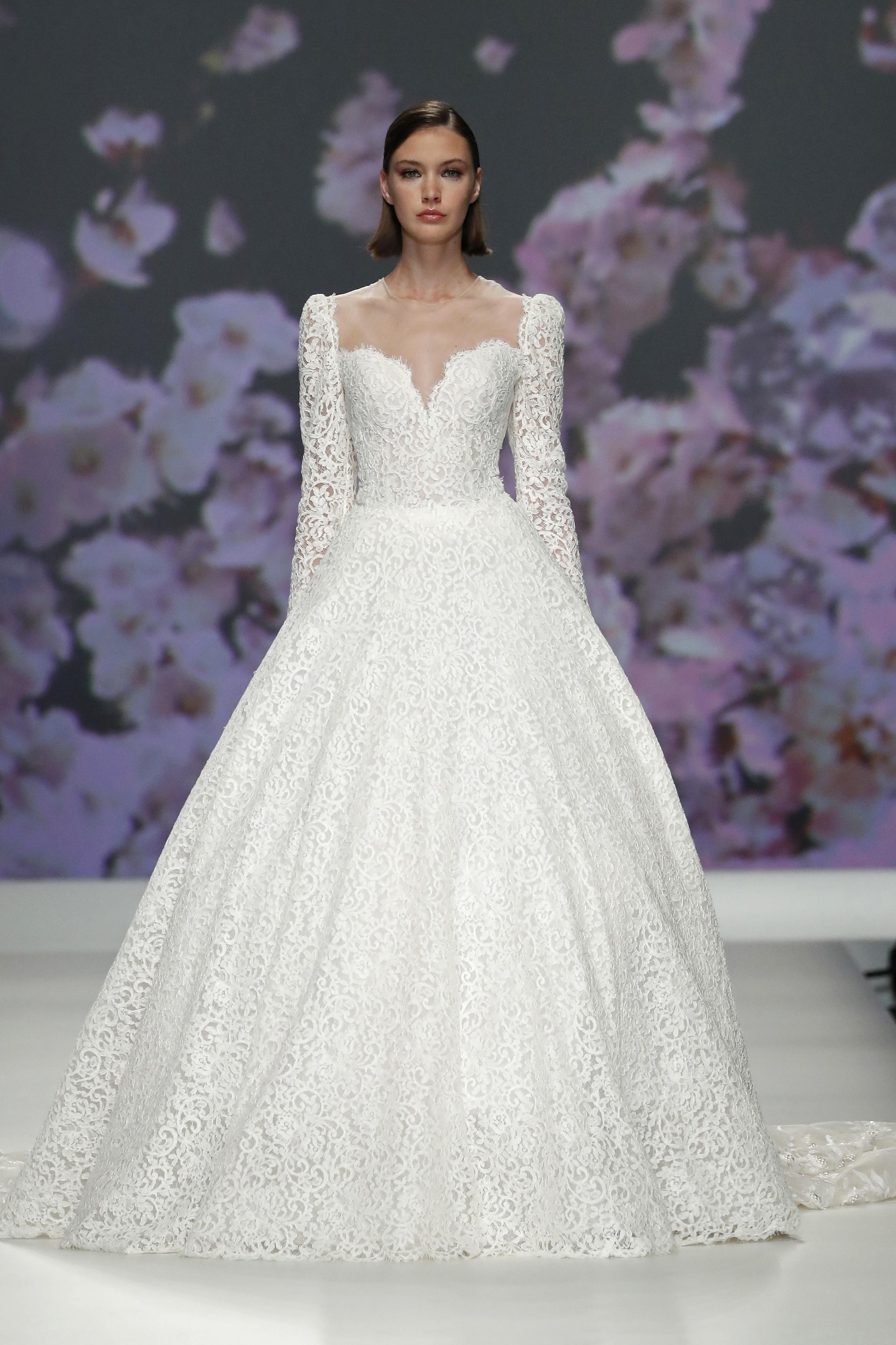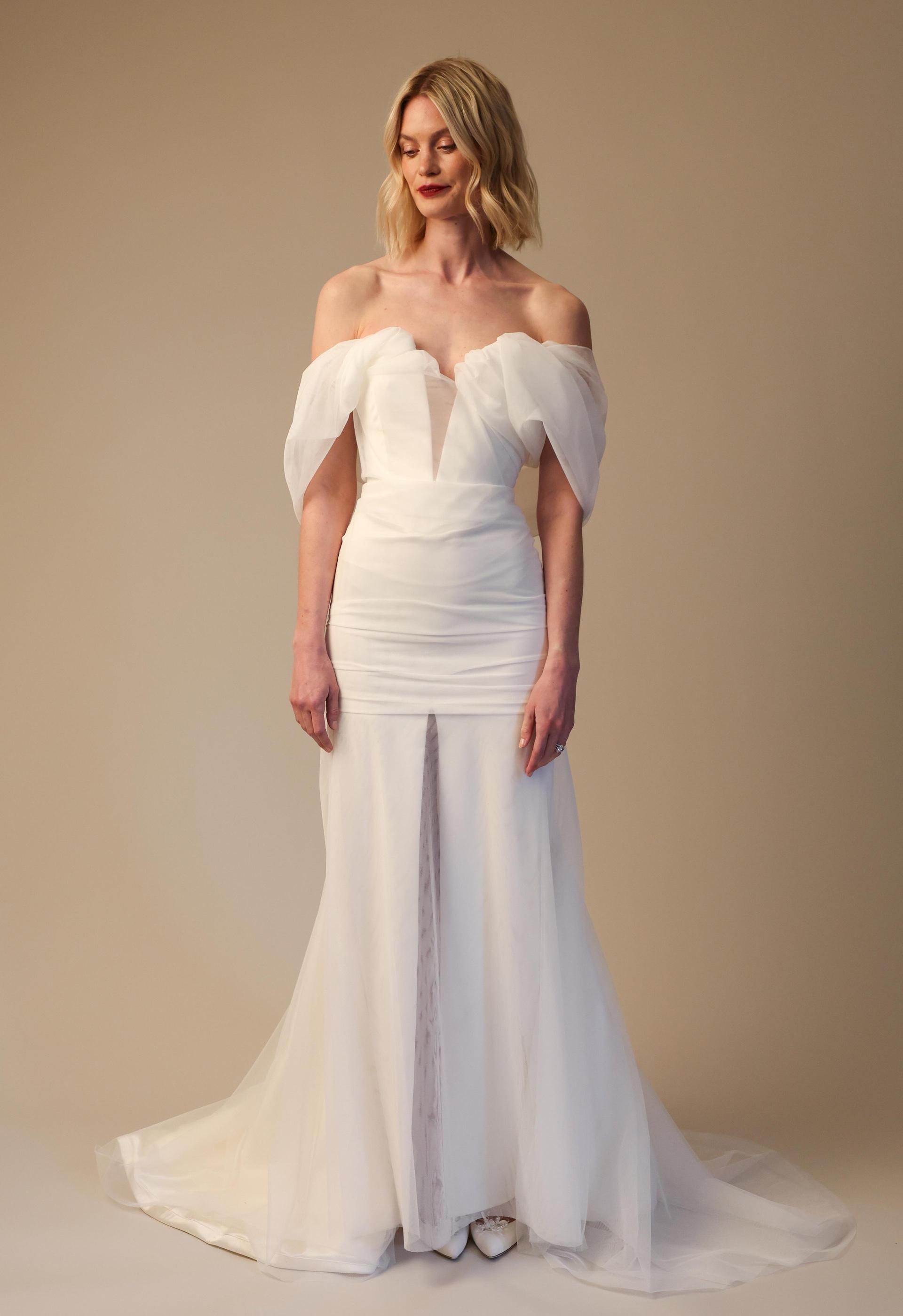 Особенно хорошо пышные силуэты смотрятся на высоких невестах: чем выше рост, тем более масштабное свадебное платье вы можете себе позволить. Если хочется классики с твистом, стоит присмотреться к пышной юбке и спокойному верху по типу прямого свадебного платья — это создаст баланс между драмой и минимализмом.