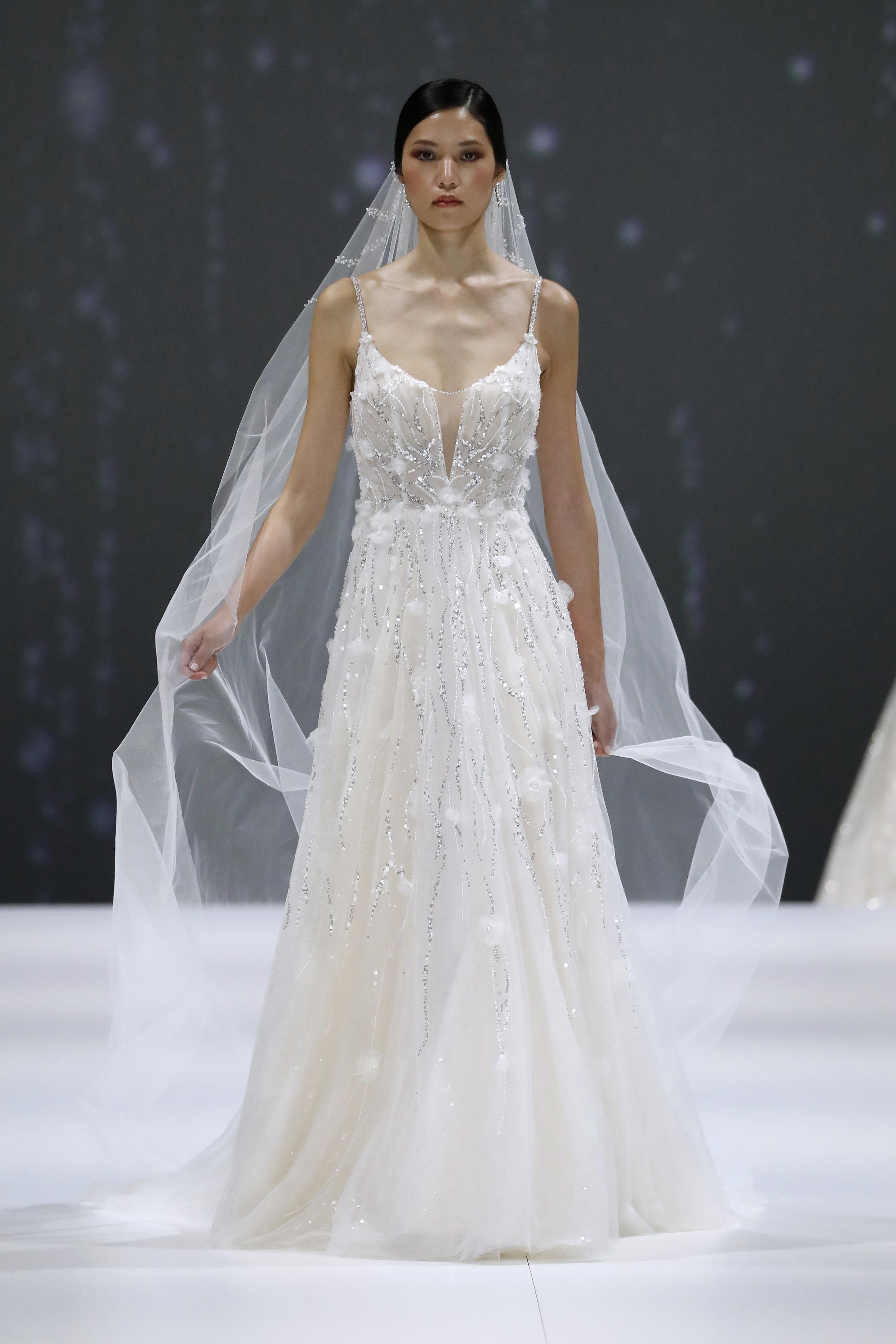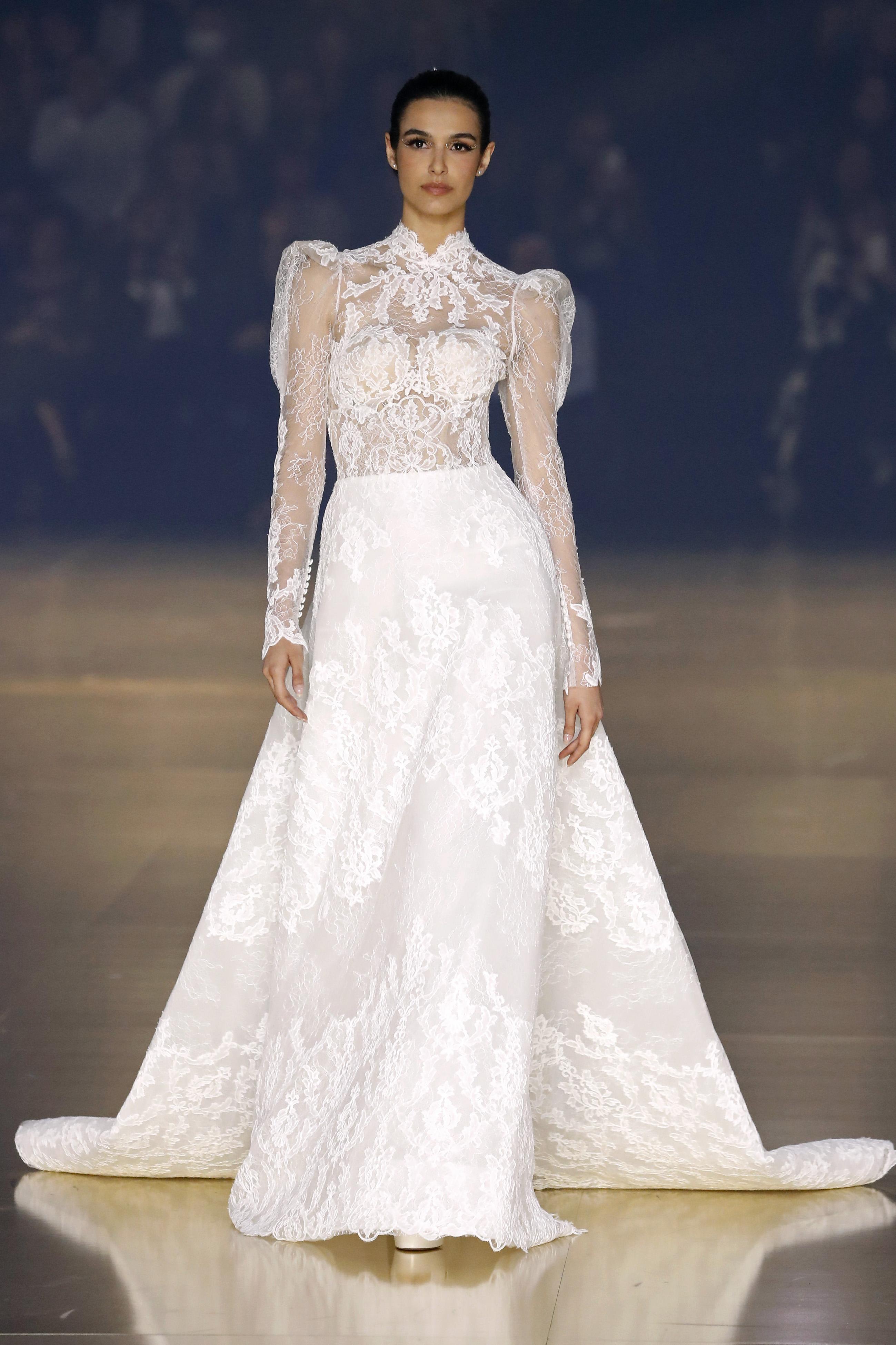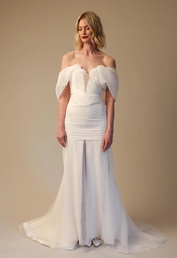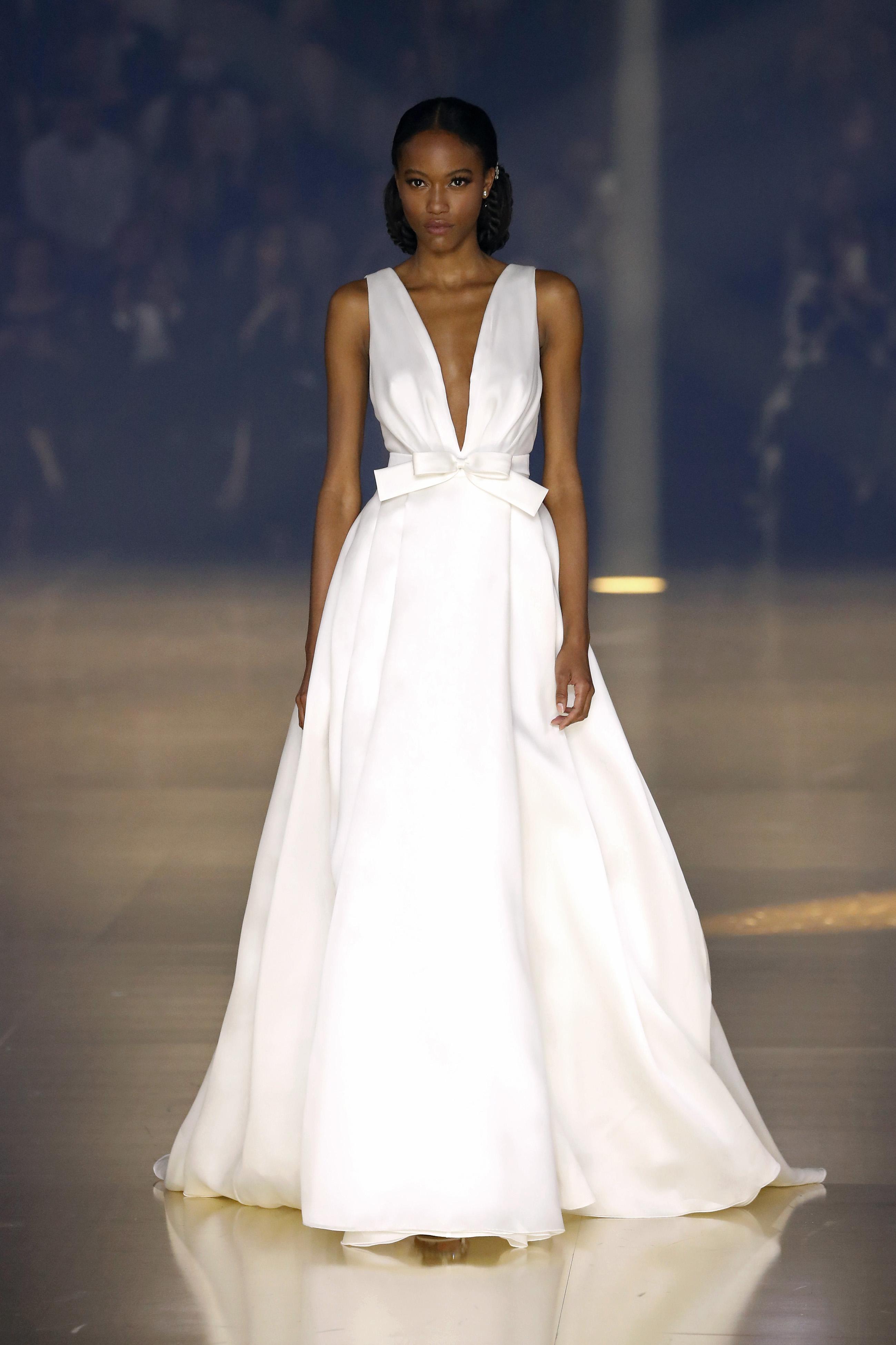 Особенно хорошо пышные силуэты смотрятся на высоких невестах: чем выше рост, тем более масштабное свадебное платье вы можете себе позволить. Если хочется классики с твистом, стоит присмотреться к пышной юбке и спокойному верху по типу прямого свадебного платья — это создаст баланс между драмой и минимализмом.