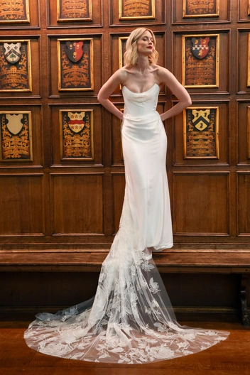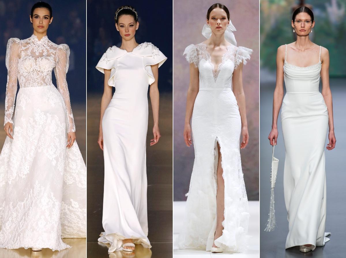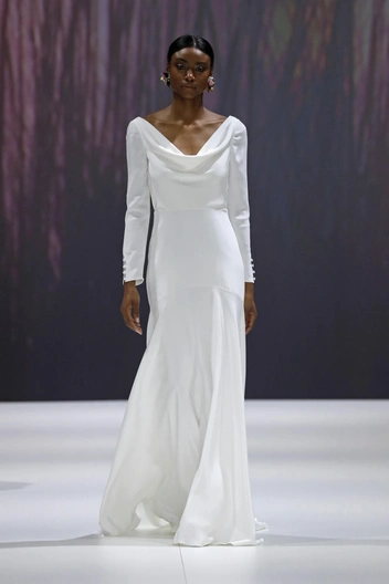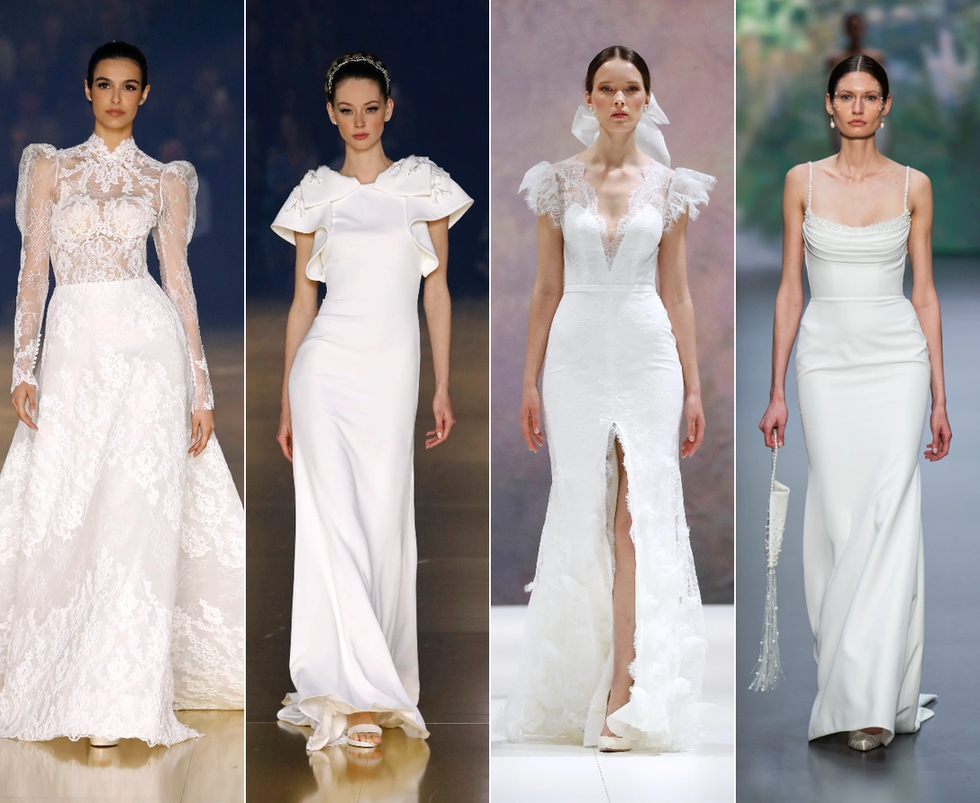 Это чистые линии, гладкие ткани, минимум декора и акцент на посадке. Сюда идеально вписывается прямое свадебное платье или лаконичный А‑силуэт.