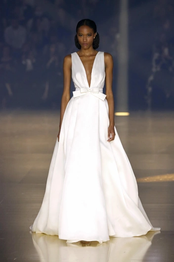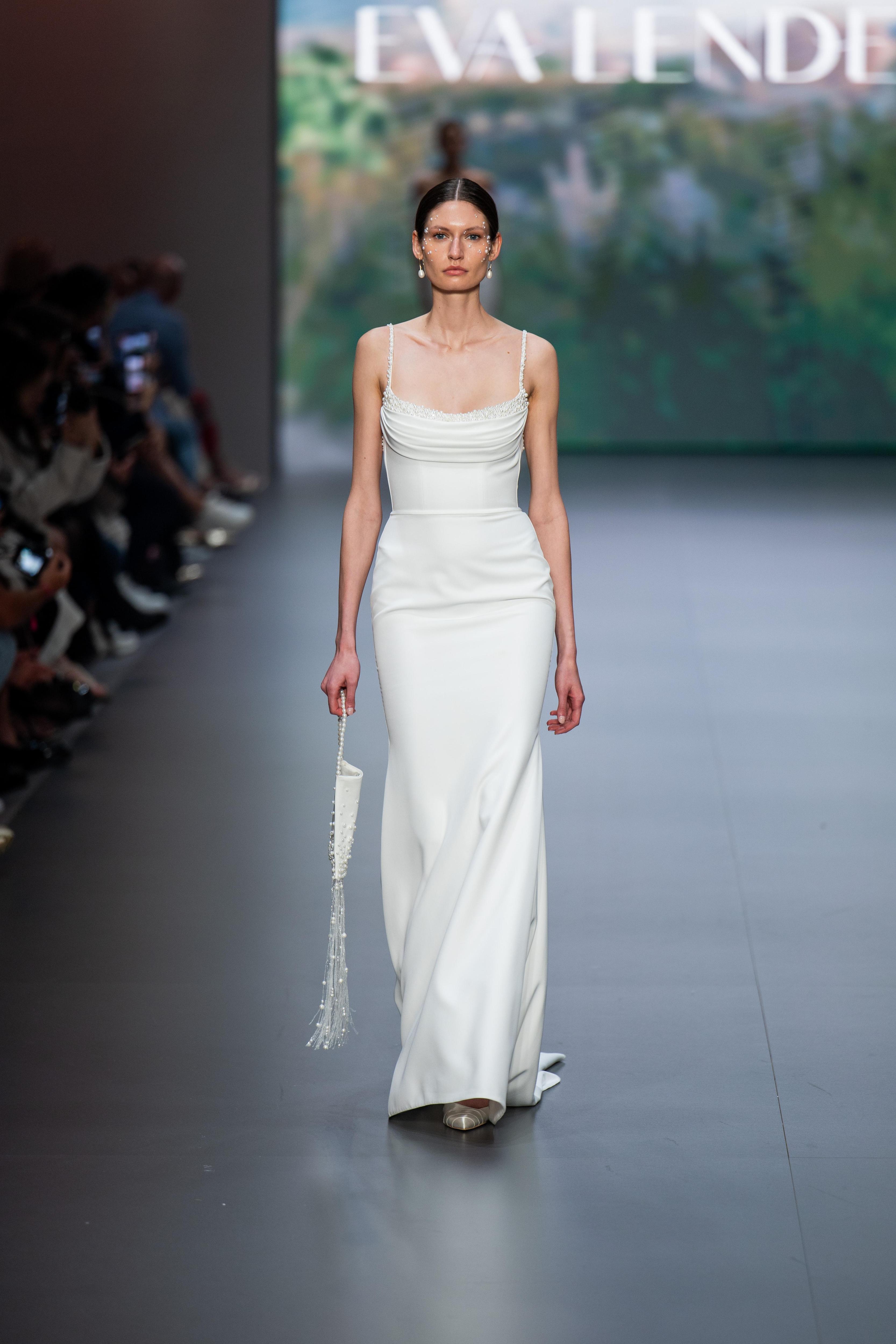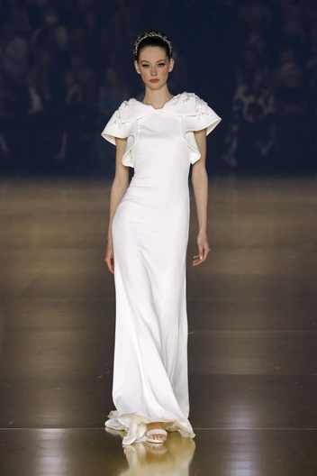 Если вам близок минимализм, стоит рассмотреть прямое свадебное платье в пол из тяжелого шелка или матового атласа — оно красиво держит форму, не требуя лишнего декора. Для любительниц драматичных выходов длинные свадебные платья 2026 предполагают шлейф, драпировки, сложный лиф или игру контрастов: белый верх и чуть более темный, например, молочно-кремовый низ (читайте также: Весна — время для самых нежных оттенков: выбирайте эти 7 подиумных цветов).
