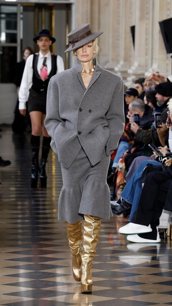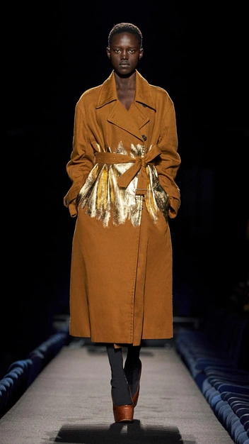 Пока одни тяготеют металлическим эффектом, французские марки акцентировали наше внимание в своих коллекциях на золоте. Это могут быть сапоги-слоучи и ботфорты, как у Vivienne Westwood, или массивные фигурные браслеты, в которых выходила Наоми Кэмпбелл на показе Off-White. Но сердце модных критиков завоевало пальто Dries Van Noten, на талию которого, словно кистью, нанесли широкие мазки золотом.