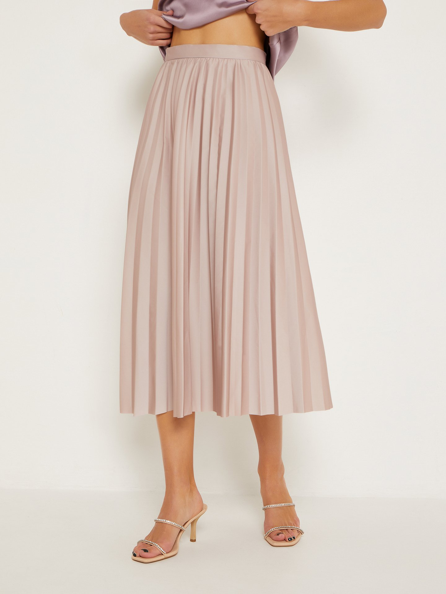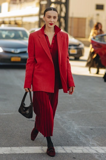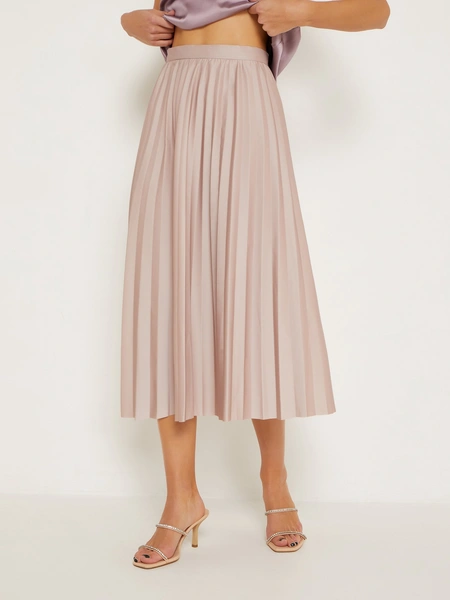 В основе этого образа будет плиссированная юбка миди. В качестве верха можно надеть топ, хорошо если он будет в бельевом стиле и на тонких бретелях, тогда на него можно накинуть объемный джемпер со спущенным плечом, так, чтобы виднелась бретелька топа. В качестве обуви можно надеть низкие кеды, что добавит нотку несерьезности в ваш образ.