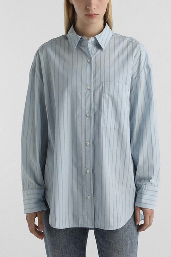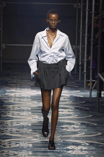 Следующая остановка — рубашки. Свежие белые и в оттенке baby blue, они делают акцент не на талии, а на нашем удобстве — рубашки представлены в размере оверсайз и выпущены наружу. А сочетать их рекомендуют с теми же юбками — прямыми, но невероятно комфортными.