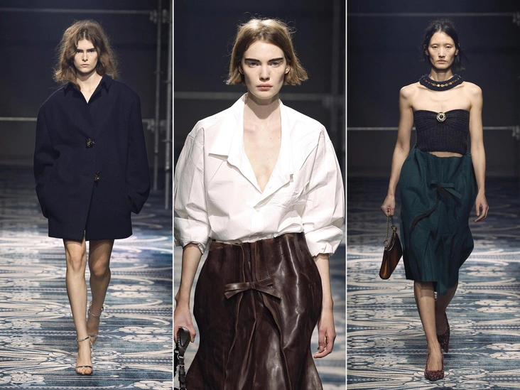 Если вам не хочется тотал-лука со свободными фасонами, как на последнем показе Prada весной 2025, то сочетайте такие вещи с чем-то более строгим. Узкие брюки+длинный блейзер оверсайз = игра с пропорциями, при которой ноги будут казаться более стройными на фоне объемного верха. Кстати, нейросеть уже назвала этот стайлинг прием хитом осени (читайте также: Сверхширокие плечи и романтичное кружево: главные тренды осени 2025 по версии искусственного интеллекта).