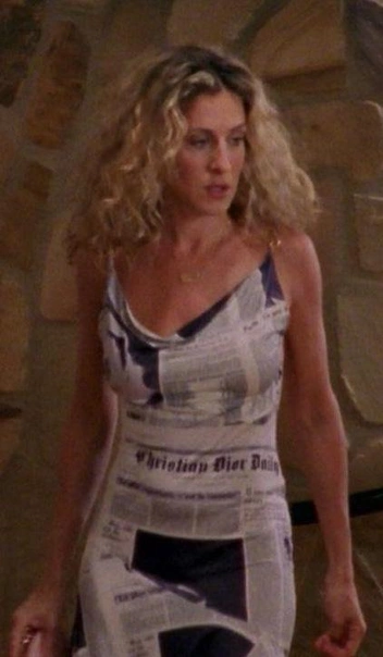 Самым спорным в этом выходе остается не само платье, а то, что героиня Сары Джессики Паркер вообще смогла себе его позволить. Как журналистке средней руки с постоянными жалобами на нехватку средств купить образ Christian Dior — ничего не есть? Жить в кредит? Впрочем, тут мы слушаем и не осуждаем. Итак, это платье-газета вошло в коллекцию Dior 2000, когда в его главе еще стоял Джон Гальяно. Забавно, что сезоном ранее Гальяно уже заигрывал с темой бедняков (газета — то, чем они накрываются), но тогда встретил непонимание со стороны общественников. Однако в нулевые их мнение волновало дизайнеров меньше всего, так что платье в итоге вышло и стало культовым.