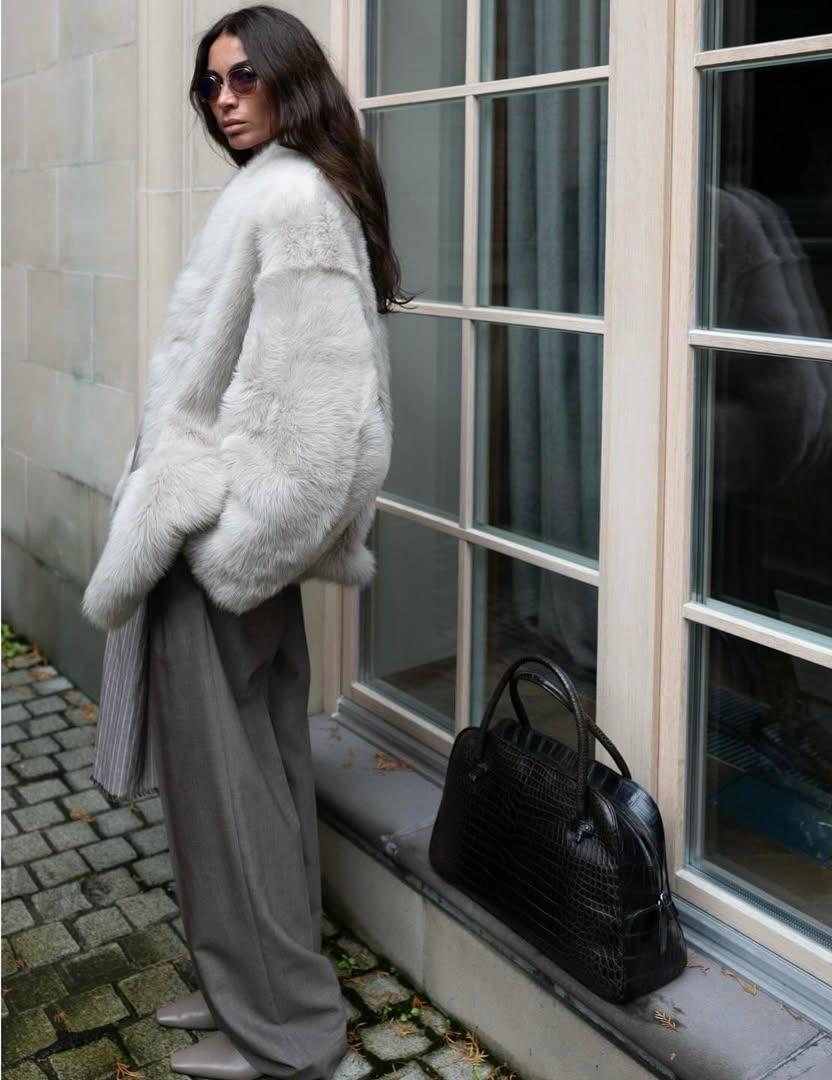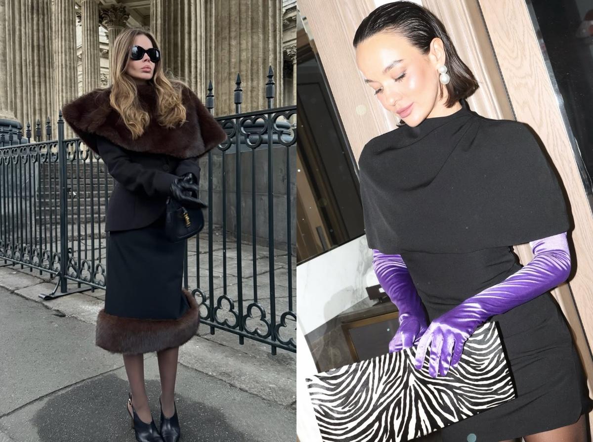 Лучший сценарий — костюм или строгие брюки с идеальной посадкой, лаконичное боди или шелковый топ и поверх — кейп из костюмной шерсти или структурного меха. Такой ансамбль выглядит дороже любого привычного палантина: кейп «собирает» линию плеч, подчеркивает шею и буквально «подсвечивает» лицо. Внизу — высокие сапоги или остроносые лодочки, небольшая структурированная сумка и длинные перчатки как финальный штрих.