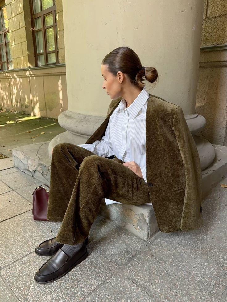 Пиджак с мягкой линией плеч и подчеркнутой талией, прямые или слегка расклешенные брюки, которые красиво сочетаются с классическими лодочками или лоферами, — ваш идеальный аутфит для антракта с бокалом шампанского.
