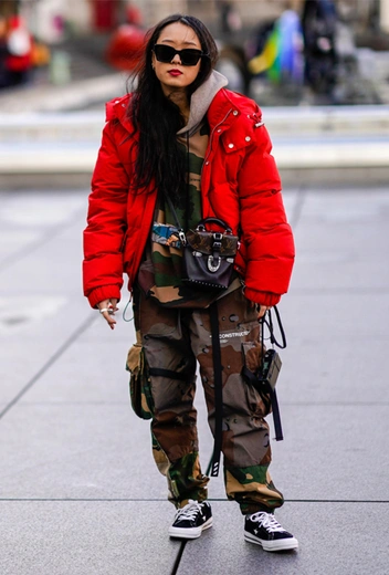 Широкие брюки карго, камуфляжные принты, объемные толстовки, грубые ботинки и небрежно накинутый пуховик – вот униформа современной поклонницы агендерных тенденций. Объемно, дерзко, маскулинно.