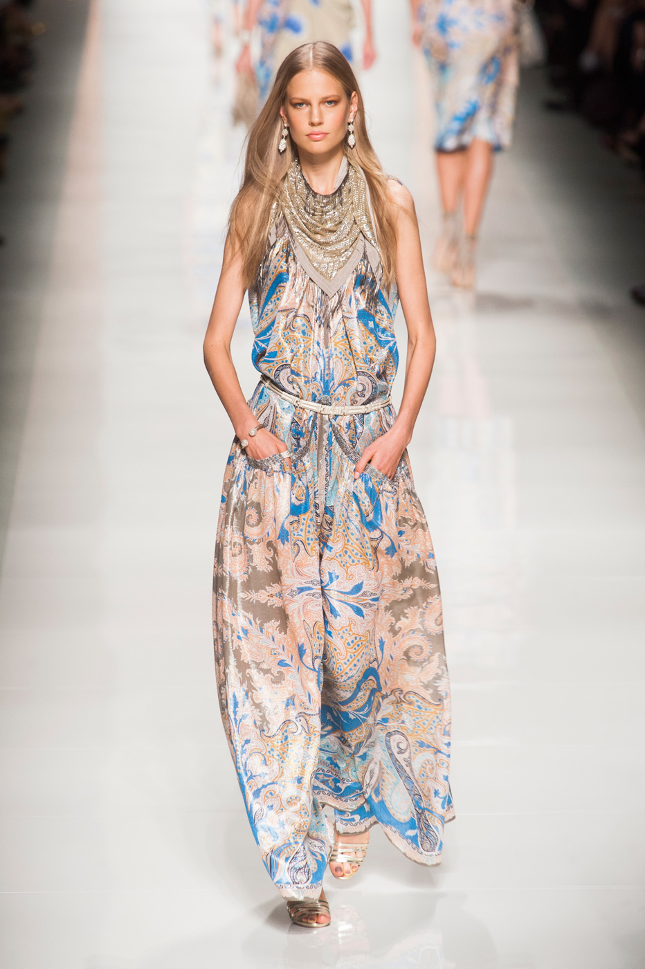 #5. ETRO Принты – отличительная черта марки. Когда я брала интервью у Вероники Этро (Veronica Etro), она всячески подчеркивала именно эту сильную сторону бренда. Коллекция Etro весна-лето 2014 еще раз доказывает, что без «турецкого огурца» Etro не Etro. Если честно, у меня создалось впечатление, что вся одежда как будто бы сделана из шелковых платков, повязанных замысловатыми способами. Длинное богемное платье – мой личный must-have на будущее лето.
