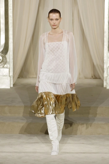 Нежелание выгодно подчеркнуть фигуру модели было видно и на свадебном платье, показанном в самом конце. Это привычный для Дома Chanel ход: после всех образов обычно выходит сказочно-красивая невеста, чей образ включает в себя все мастерство, всю фантазию дизайнера. На кутюрном показе 2025 года невеста скорее олицетворяла кризис: платье было будто на несколько размеров больше должного, а на модели были надеты все те же грубые белые сапоги.