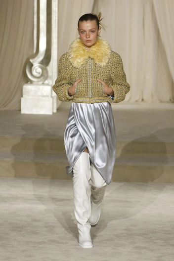 Несмотря на то, что это кутюрная коллекция, Chanel попробовали и тренды. На одной из моделей был укороченный бомбер, как из 80-х, ставший хитом прошедшей осени. То, что Chanel сочетали его с голубой атласной юбкой и белыми сапогами, в комментариях не нуждается.