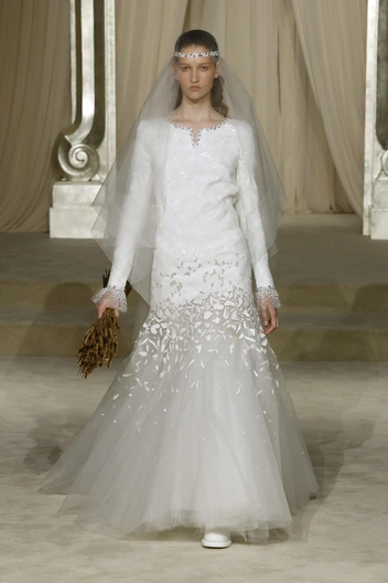 Отметим пару положительных моментов. Для начала, символизм золотого цвета — он отсылает нас к Габриэль Шанель, которая часто подчеркивала красоту и изящество пшеничных колосьев. Собственно, поэтому в руках у невесты был букет из золотых колосков, поэтому легендарный бутик на улице Камбон был оформлен бежево-золотыми тканями, и поэтому главным цветом показа был не только белый, но и золотой.