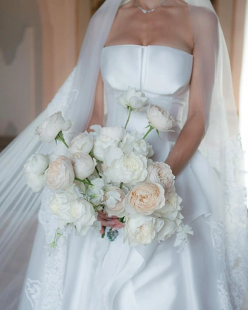 Свадебное платье Бьянки отражает испанский колорит и чуткость к женской природе. Невеста выбрала кружевное платье с длинными рукавами, корсетом ручной работы с кремовой шифоновой накидкой, белые босоножки от Roger Vivier с инициалами пары и датой их свадьбы и украшения Messika из белого золота (читайте также: В чем выйти замуж зимой 24/25 — 5 идеальных образов).