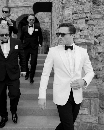 Модель дополнила образ перчатками, винтажными украшениями, длинной кружевной фатой и обувью бренда Christian Louboutin. А также кельтским ожерельем в серебряных и голубых тонах, которое невесте подарила мама Эда. Для торжества Эд выбрал классический стиль — белый смокинг от бренда Giorgio Armani, поклонником которого он является.