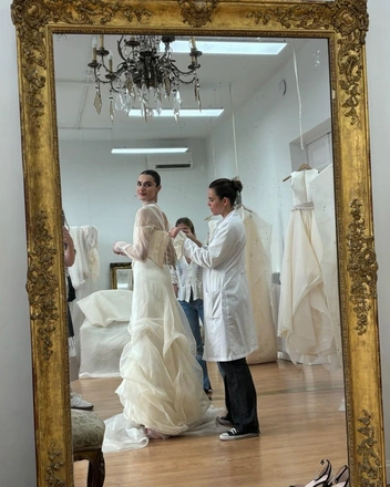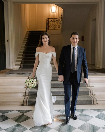 Свадебное платье Бьянки отражает испанский колорит и чуткость к женской природе. Невеста выбрала кружевное платье с длинными рукавами, корсетом ручной работы с кремовой шифоновой накидкой, белые босоножки от Roger Vivier с инициалами пары и датой их свадьбы и украшения Messika из белого золота (читайте также: В чем выйти замуж зимой 24/25 — 5 идеальных образов).
