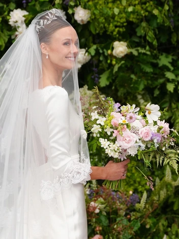 Невеста предпочла винтажное белое платье от лондонского дизайнера Emma Victoria Payne с рукавами три четверти и кружевом. Дополняют ее наряд шлейф, кружевная фата, которая была выпущена в 1880 году, а также фамильная тиара Фаберже из листьев мирта (читайте также: От бижутерии до бриллиантов: тиары шведской королевской семьи).
