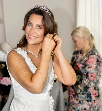 Для церемонии Марта Луиза выбрала белое платье без рукавов от норвежского дизайнера Tina Steffenakk Hermansen. Дополнили образ прозрачная длинная фата, колье и серьги.