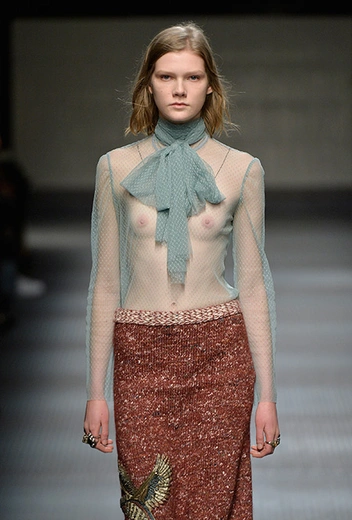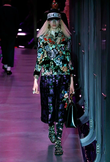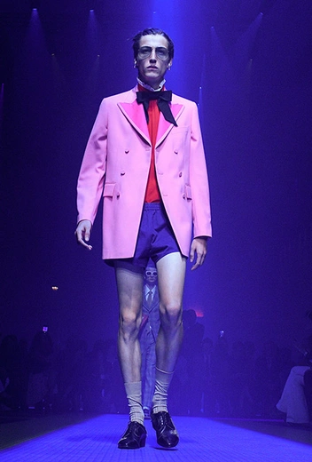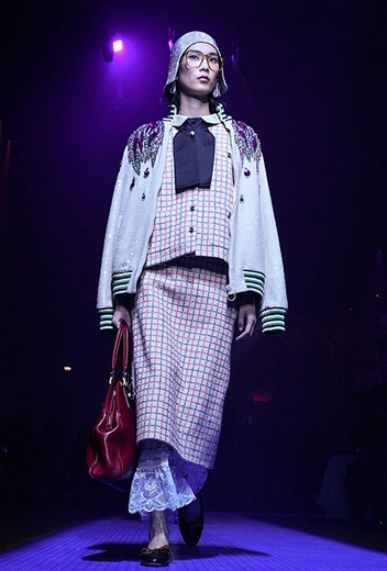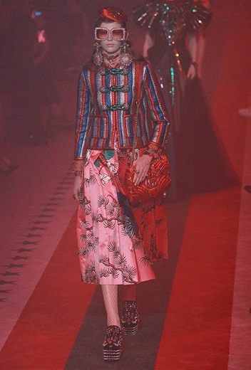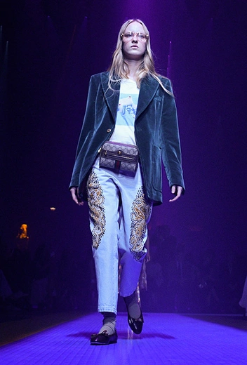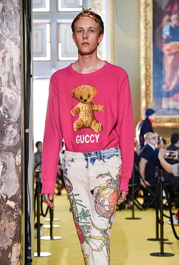Если в начале работы для Gucci новый креативный директор еще создавал прозрачные блузы, невесомые платья и вещи с глубокими V-образными вырезами в духе Тома Форда, то с течением времени «секс» исчез из его коллекций полностью. Девушка Gucci теперь не решительная городская амазонка, а эксцентричная чудачка. Полупрозрачные ткани и кожу рептилий заменили бархат и твид. Облегающие силуэты сменились «бабушкиными» рюшами и сложной многослойностью. Героиня Микеле не боится быть смешной – носит несуразные очки, надевает босоножки прямо на колготки, не забывает про странные головные уборы и большие зонты. Мужчины же (начиная с сезона FW 2017 бренд показывает мужскую и женскую коллекции вместе) не стремятся к нарочитой маскулинности – они скорее похожи на фриков или милых «ботаников» в галстуках-бабочках, вельветовых брюках, пиджаках с яркой вышивкой. Как показывают растущие цифры продаж, тот новый образ востребован в наши дни куда больше, чем поднадоевший "гламур" родом из 90-х и нулевых.