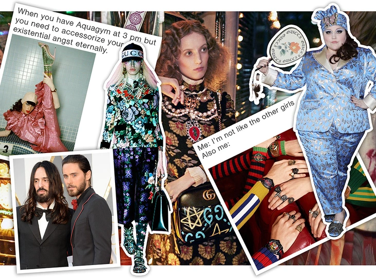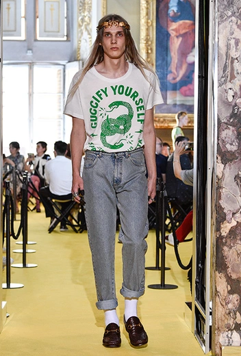 Способность не воспринимать себя всерьез в наше время ценится невероятно высоко. Надменность и чрезмерная серьезность остались в ХХ веке, так же как демонстративная роскошь и эротизация всего и вся. «Новый Gucci» и тут в авангарде тренда. Ироничны, в первую очередь, сами образы транслируемые Алессандро Микеле – его чудаки и чудачки, одетые в «бабушкины» вещи и элегантны и забавны одновременно. Но кроме этого, дизайнер не боится напрямую высмеивать и себя, и моду, и мир в целом. В коллекции Resort 2018 были футболки с логотипом Guccy - так название марки часто коверкают производители подделок. В том же сезоне был придуман ироничный слоган Guccify Yourself и надпись Common Sense Is Not That Common.