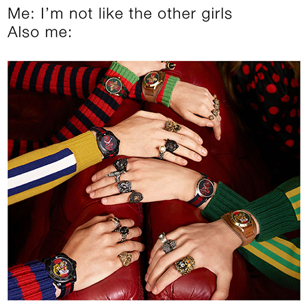 Такой успех марки в соцсетях объясняется, во-первых, грамотной работой SMM-менеджера. Instagram (запрещенная в России экстремистская организация) «нового Gucci» тщательно стилистически выверен и прекрасно оформлен. Во-вторых, как уже и было сказано, в модном доме умеют заинтересовать аудиторию, крепко «подсевшую» на интернет-контент. Главное оружие в борьбе за аудиторию – креатив и юмор. К примеру, под тэгом #GucciGram художники и фотографы с подачи бренда публикуют работы, вдохновленные его фирменными принтами – от постановочных съемок до картин акварелью. А в марте этого года прошла нашумевшая рекламная кампания #TFWGucci. Для промоушена коллекции новых часов Le Marche Des Merveilles контрибьютеры из мира искусства и мультимедиа сделали забавные фото по мотивам одного из интернет-мемов - на всех в том или ином качестве фигурировали те самые часы. Аббревиатура #TFWGucci расшифровывается как That Feeling When, по-русски – «то неловкое чувство, когда…», выражение, само по себе успевшее стать мемом. Все фото в совокупности собрали около 2 млн. лайков. Рекламная кампания позволила Gucci не только поднять прибыли, но и опровергнуть очередной стереотип, доказав, что мода и юмор явления вполне себе совместимые, а специфические шутки ценят не только «нерды», но и продвинутые модники.