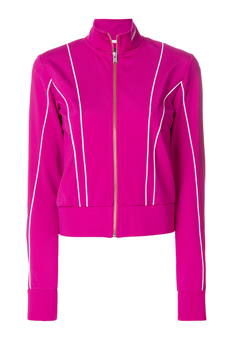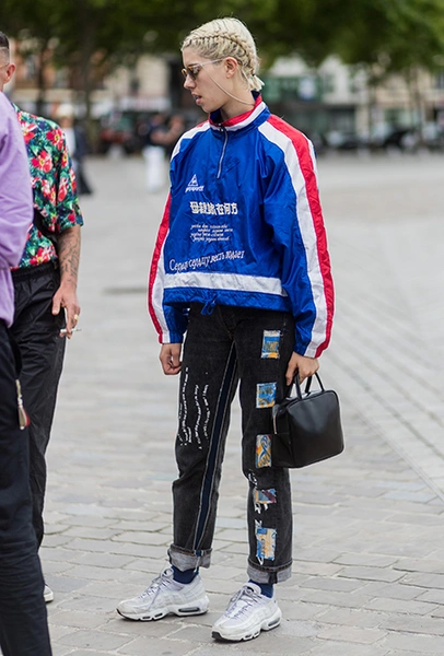 Впрочем, выбирать утрированно спортивные и минималистичные варианты совсем необязательно. Не хуже будут смотреться олимпийки, украшенные воланами или расшитые пайетками. Что касается материала, то обычно на пошив спортивных курток идет полиэстер, однако он — не единственно возможная опция. Не хуже будут смотреться олимпийки из тонкого нейлона: что-что, а они девятую декаду XX столетия передают максимально точно.