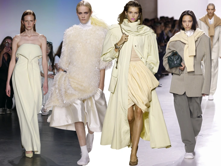 Перейдем к трендовой палитре. Ожидается, что самый большой спрос будет на кремово-желтый — самый частый оттенок прошедших Неделей моды. Теперь речь идет не только о популярном цвете сливочного масла. К нему также добавились чуть более теплый Popcorn Yellow и светлый Vanilla Yellow.