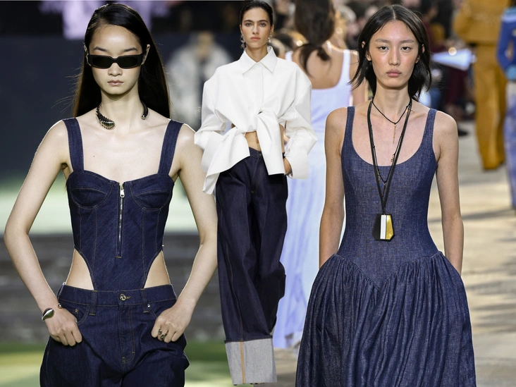 Вечная классика — синий необработанный деним — вновь взбирается на вершину трендов. Casablanca шьет из него корсетные топы, Gabriela Hearst пышные вечерние платья, Luar и Victoria Beckham отдают предпочтение курткам, а Dior и Celine заставляют переосмыслить традиционные джинсы.
