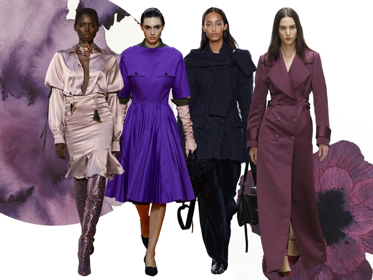 В самом трендовом сочетании миксуем их с кремово-желтым из предыдущего пункта, не менее модным лаймовым или нежно-розовым. А чтобы снизить градус, интегрируем цвет в нейтральные образы или используем только фиолетовые аксессуары.