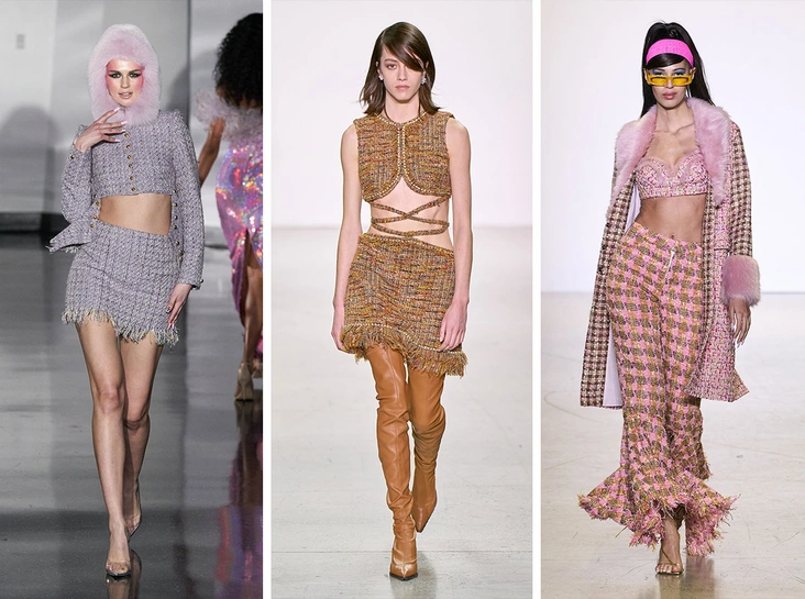Пару месяцев назад Chanel официально помирились с Saint Laurent, которых еще недавно обвиняли в плагиате их твидовых вещей. Но двум крупнейшим французским модным Домам все же удалось договориться. А теперь твид становится важным трендом и появляется в форме платьев, коротких юбок, кроп-топов и костюмов в коллекциях Christian Cowan, Prabal Gurung и Kim Shui.