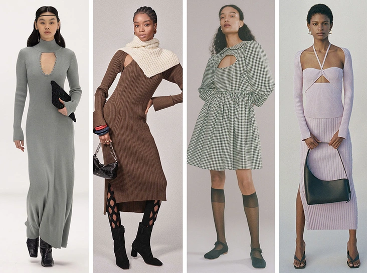 Главный тренд 2021-го останется с нами и в следующем году: дизайнеры вновь предложили нам различные вариации платьев и топов с вырезами в различных (и довольно неожиданных) местах. Теперь в центре внимания — облегающий трикотаж, сборки и декор из шнурков.