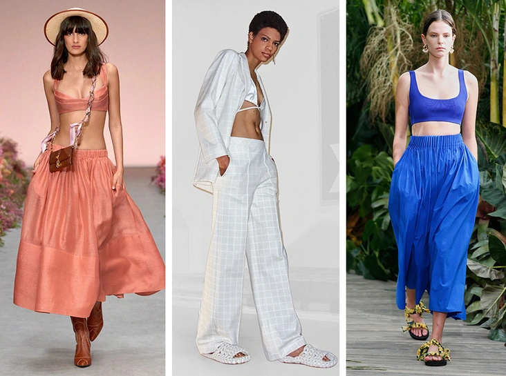 Всем нам нужно больше витамина D, а поэтому не удивительно, что дизайнеры предлагают интегрировать смелое бикини в повседневные образы, которые на самом деле для отдыха не предназначены. Трикотажные бра-топы мы с удовольствием носим уже который сезон. Сейчас актуальными будут как сочетания с соответствующими по цвету и фактуре кардиганами и уютными трикотажными юбками, так и комбинации с джинсами, свободными брюками и классическими пиджаками. А Jason Wu и Tibi и вовсе предлагают носить бра поверх платьев — выбор как обычно за вами.