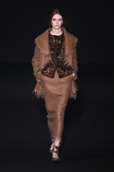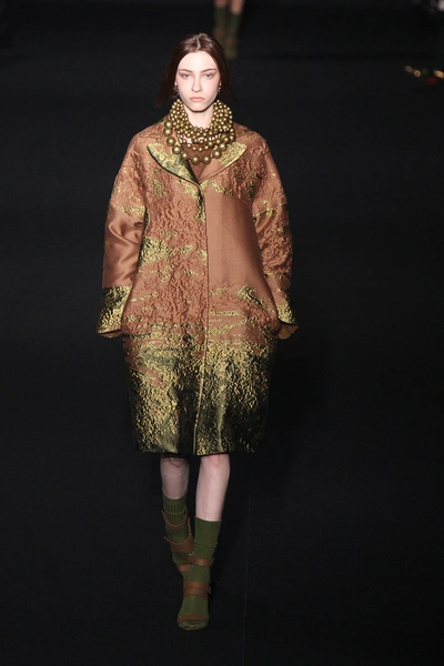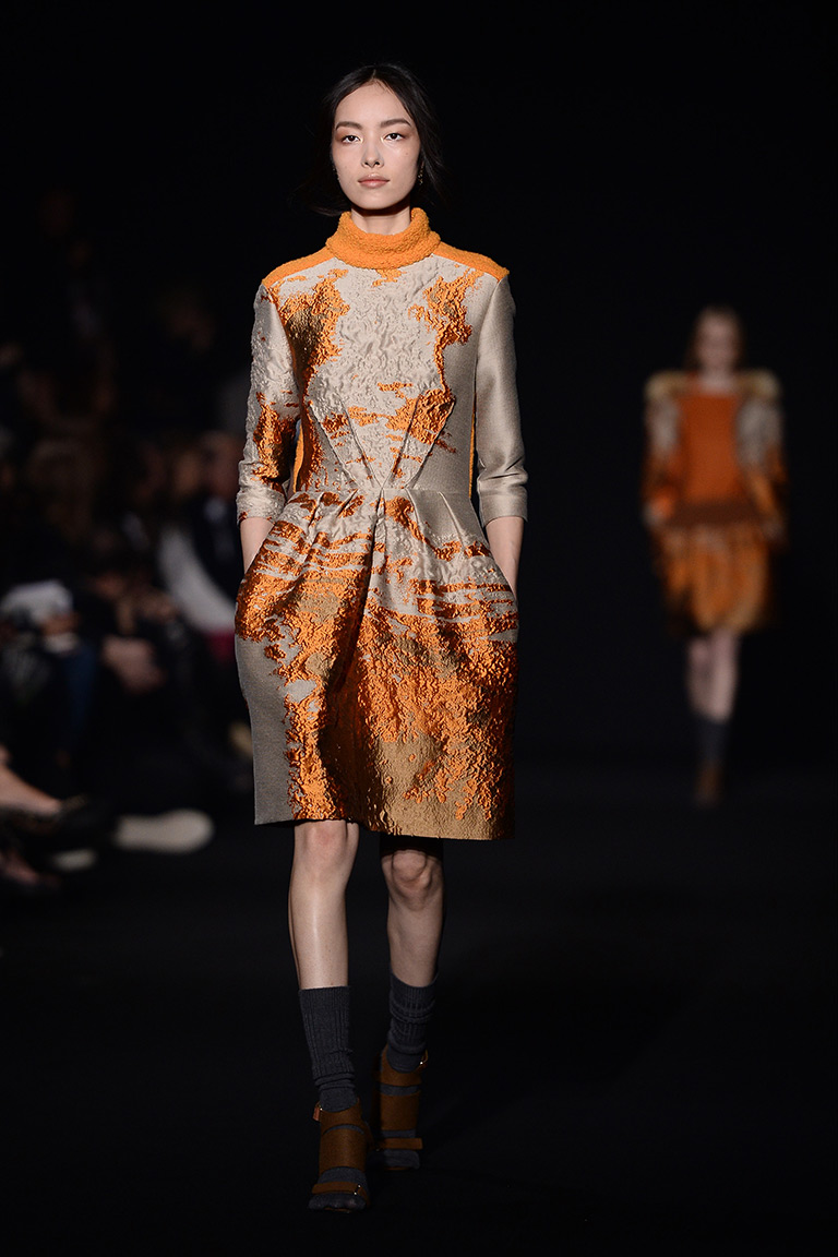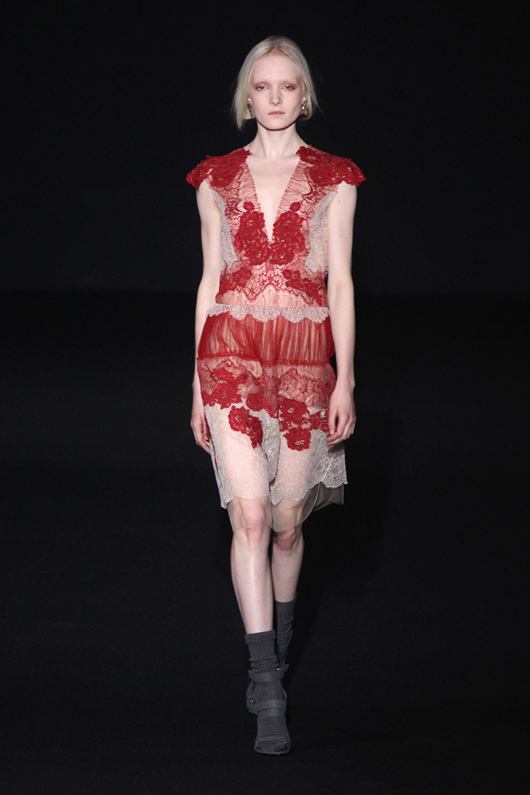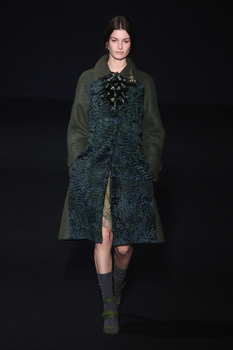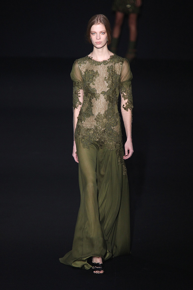 Главные материалы – жаккард, кружево и хлопок. Основные цвета – лесные: все оттенки зеленого, коричневый и темно-желтый. Мрачное и таинственное настроение ближе к концу показа помогает создать кроваво-красный, почти такой же, как в шанхайской коллекции Valentino.