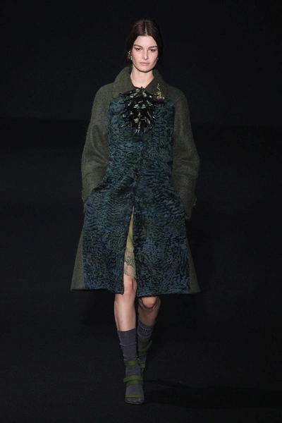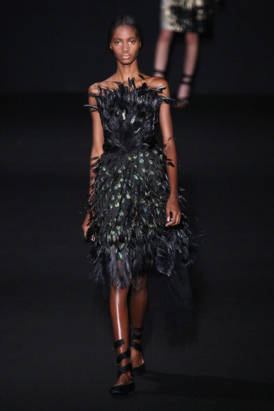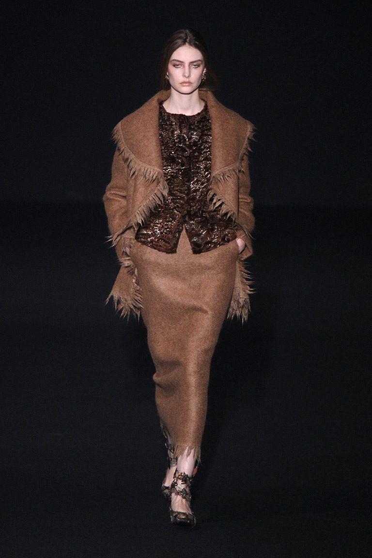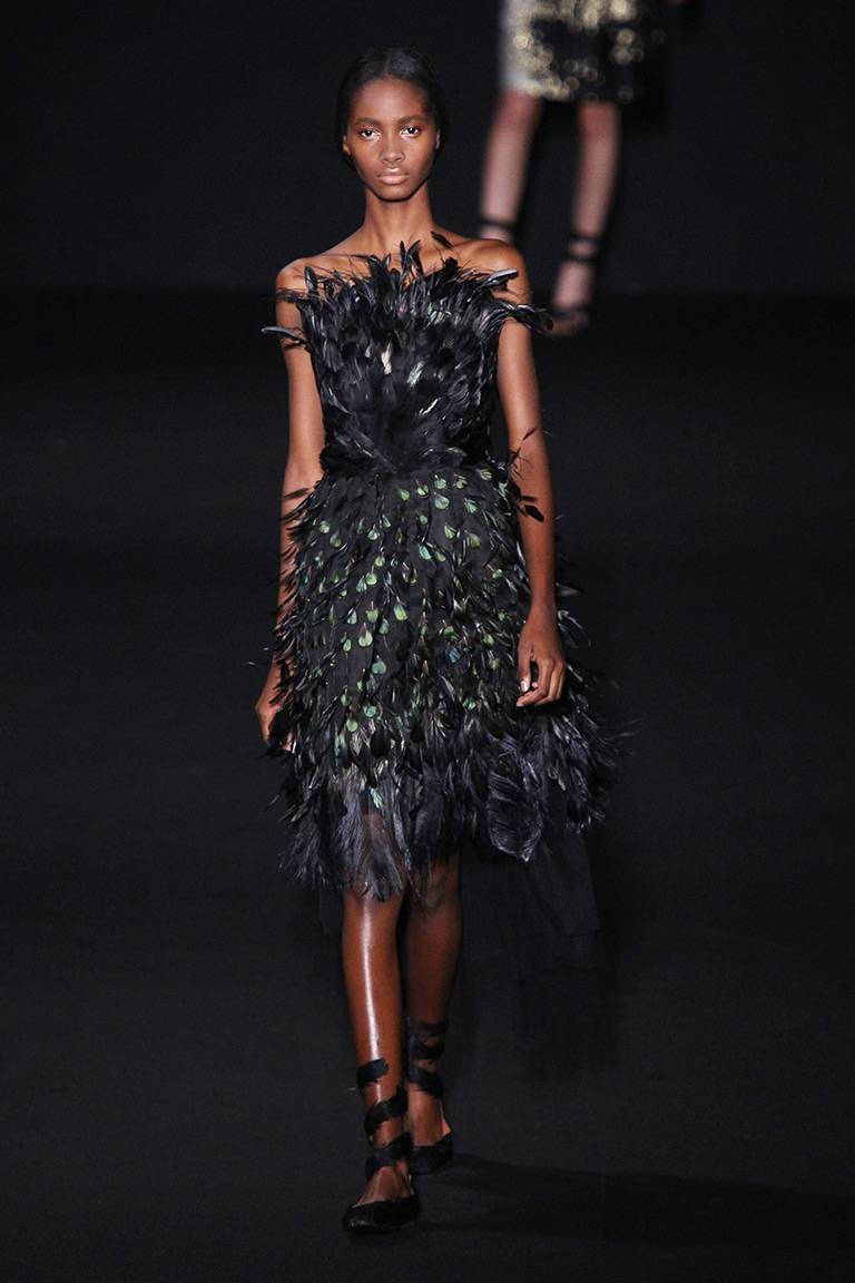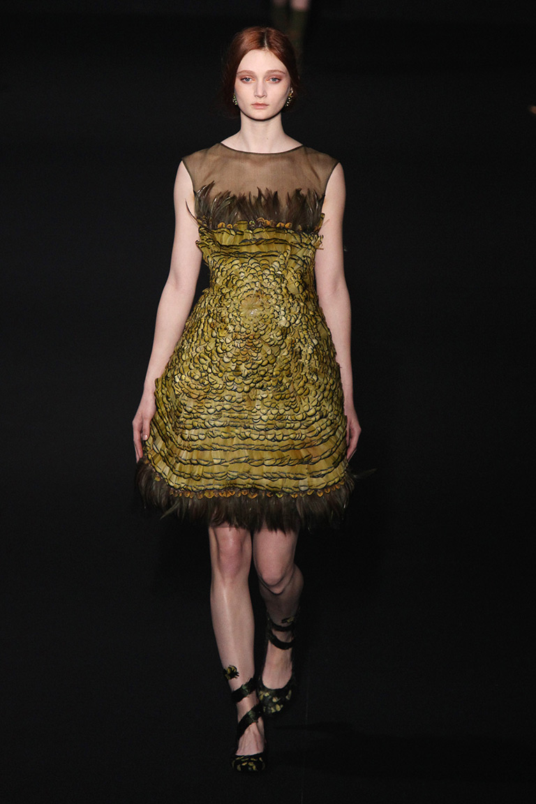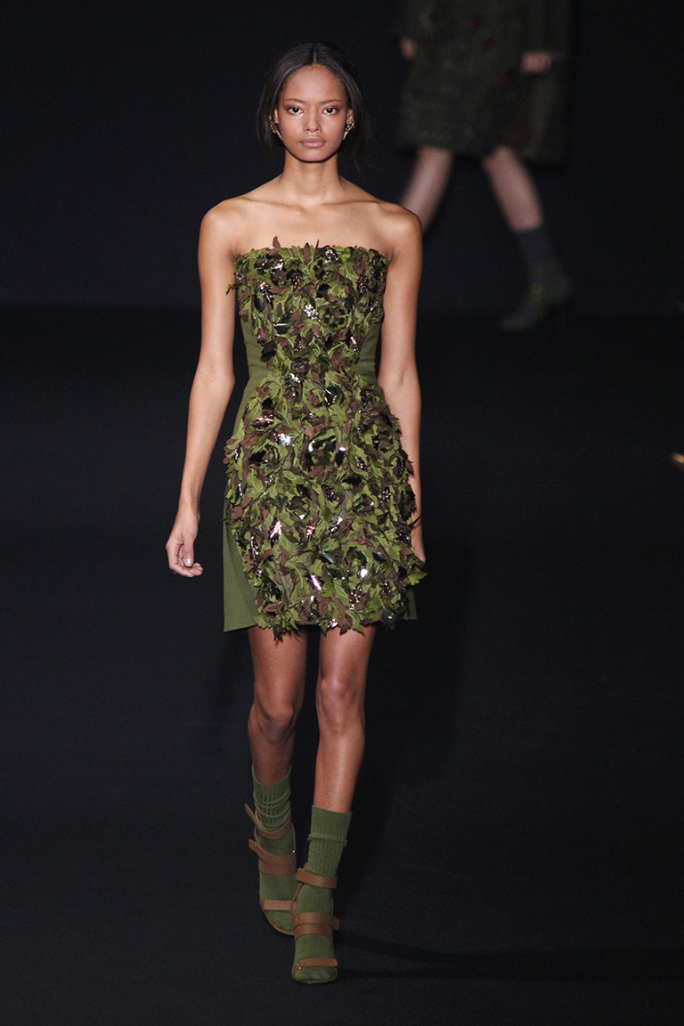 Альберта Ферретти глубоко окунулась в эту тему, создав «лесную» коллекцию при помощи сложных текстур и украшений. Например, вкрапления золотого цвета на жаккардовом зеленом пальто выглядят как прочная кора дерева. Дизайнер добавляет настроения при помощи блесток, перьев и цветочных аппликаций с лентами. С такими деталями был риск чрезмерного эпатажа, но у Alberta Ferretti все выглядит очень женственно и чувственно.