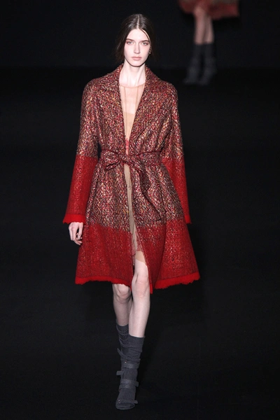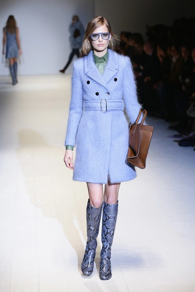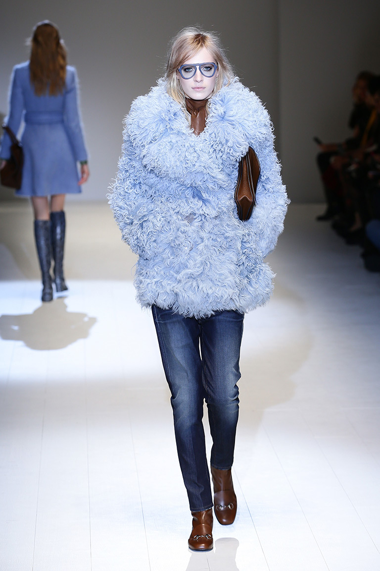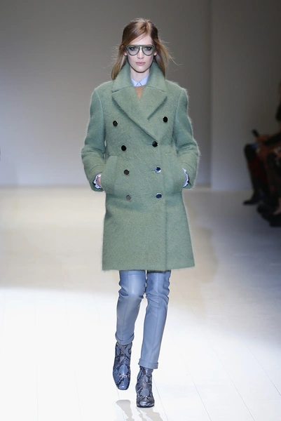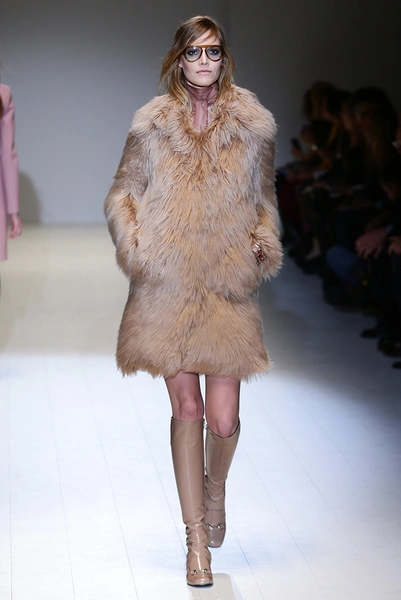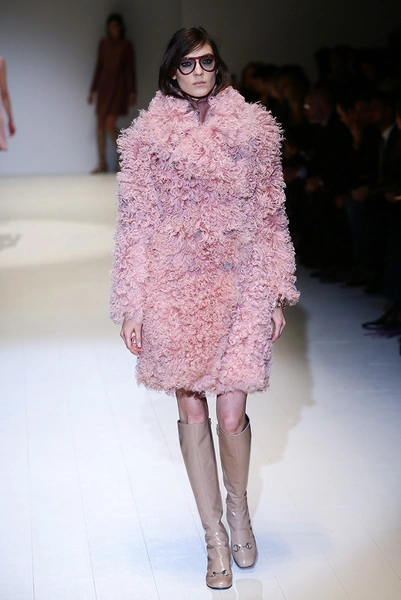 Дизайнер вдохновилась 60-ми и особенно британской актрисой Джули Кристи (Julie Christie). В этой коллекции она сочетает четкие и строгие формы с мягкой палитрой оттенков – розовым и бежевым, пепельно-голубым и зеленым цветами. Из ярких тонов – желтый и бордовый. Основной материал – кожа. Отдельно стоит отметить объемные шубы и пальто, которые выполнены из курчавого меха, похожего на овечий. Аксессуары – большие очки и сумки-мешки ярких цветов.