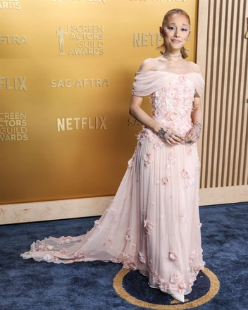 Очаровательный розовый образ на премии SGA показала Ариана Гранде. Звезда появилась в длинном платье Loewe, которое напоминало ни то наряд принцессы Disney, ни то феи из сказок. Его корсет был полностью усеян был полностью усыпан тканевыми цветами, которые будто опадали на юбку. К своему выходу актриса также добавила фирменным высоким хвостом, бриллиантовым чокером на шее и небольшими серьгами. А легкий розовый макияж с акцентом на румянах смог выигрышно подчеркнуть нежный оттенок платья.