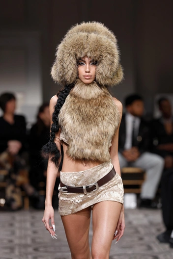 Непривычно видеть эти два стиля рядом, но Нью-Йорк умеет удивлять. Поэтому на прошедших показах мы ожидаемо увидели стиль Y2K в его лучших традициях с рваными джинсами, короткими топами, ремнями низкой посадки и, конечно, мехом. Последний, конечно, разработан эко-путем — эстетика эстетикой, а получить «отмену» никто не хочет.