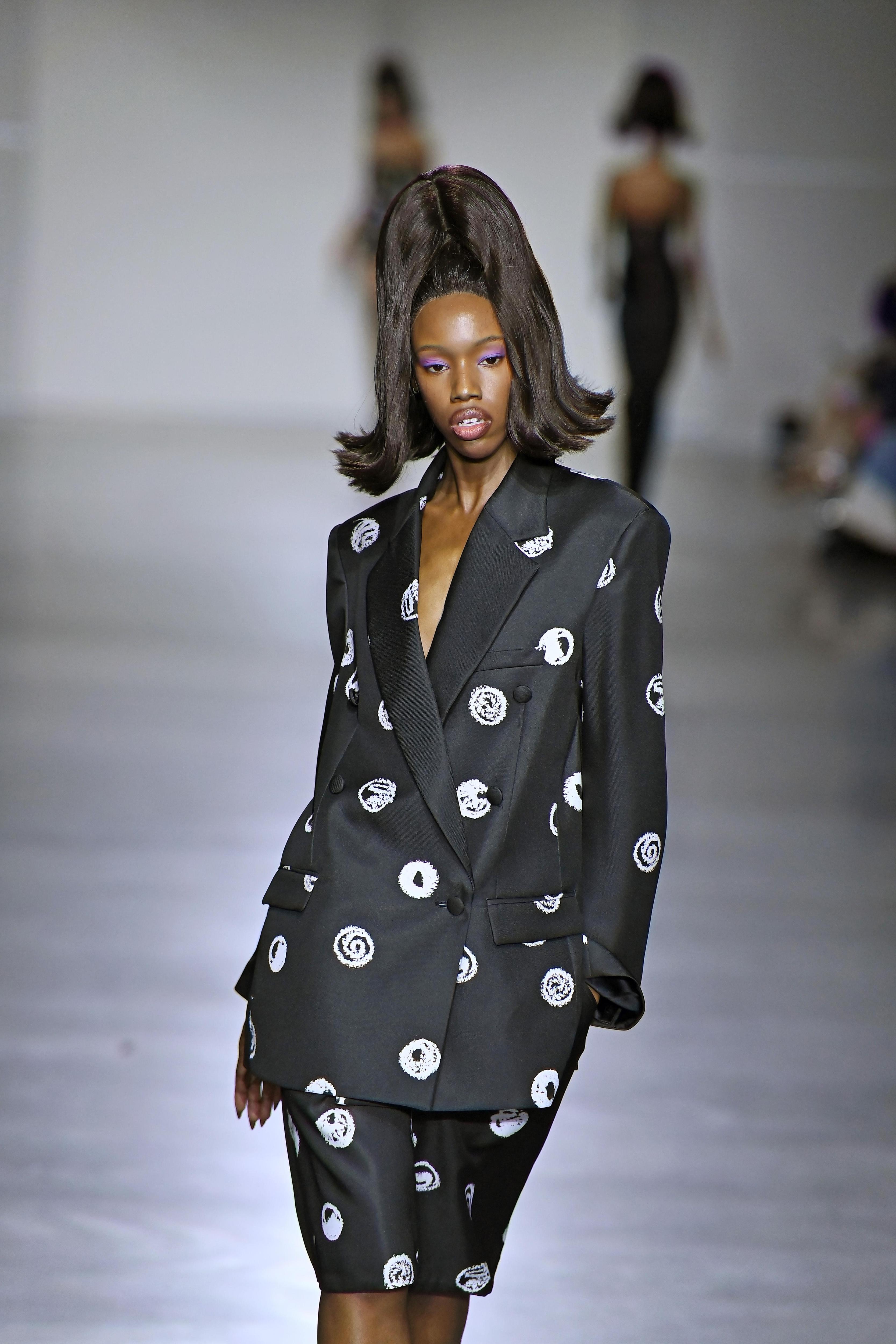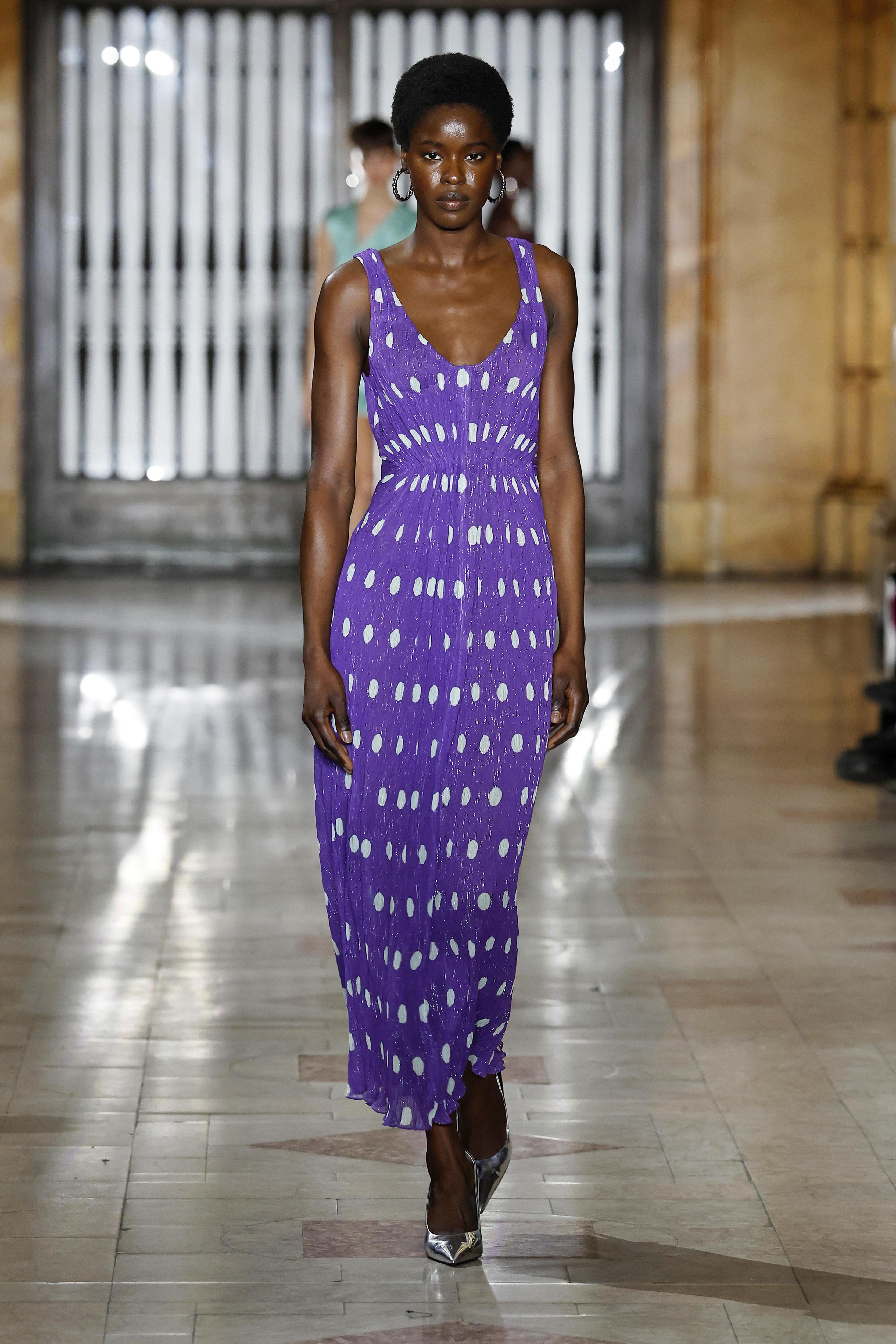 Принт «горошек» рассыпался по многим подиумным коллекциям, снова отсылая нас к стилю ретро. Видим его в исполнениях на любой вкус: классический черно-белый вариант на трикотаже (что хорошо при холодной погоде), в костюме с юбкой и широкоплечим пиджаком, а также в милом платье фиолетового цвета с люрексом (читайте также: Как проходит модный сезон: исчерпывающий гайд по году).