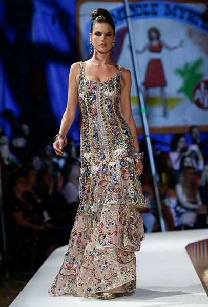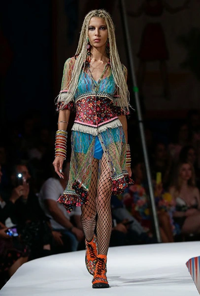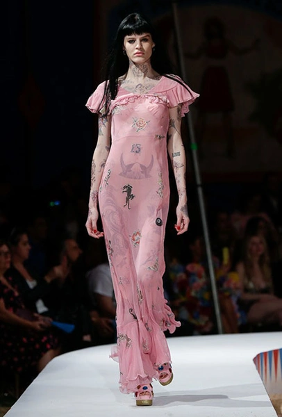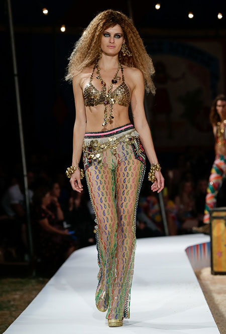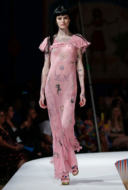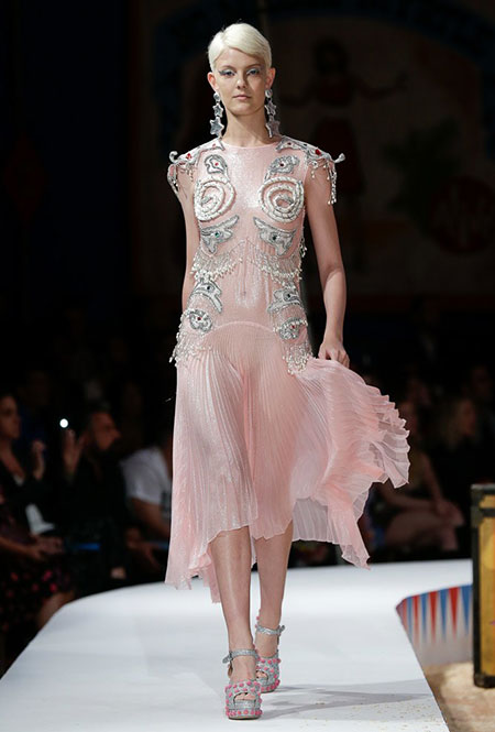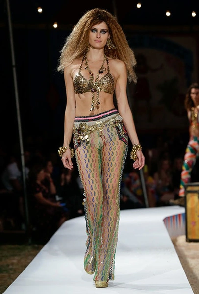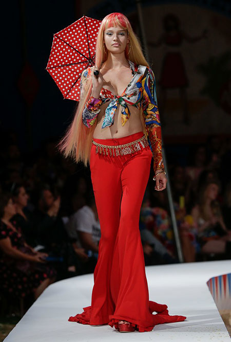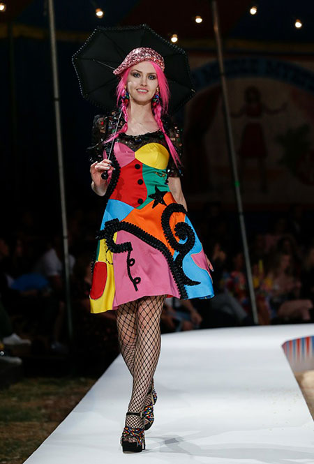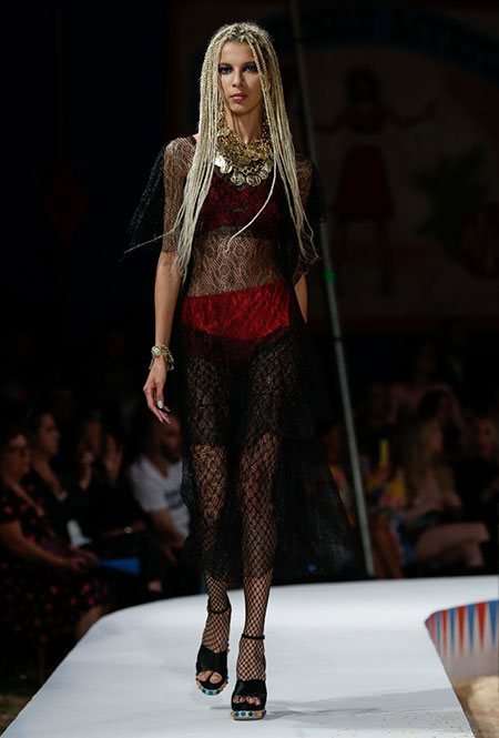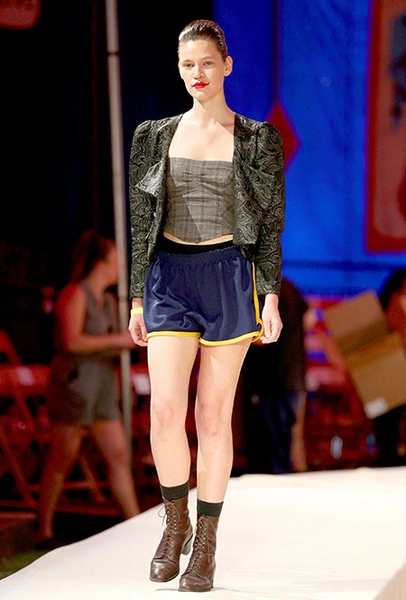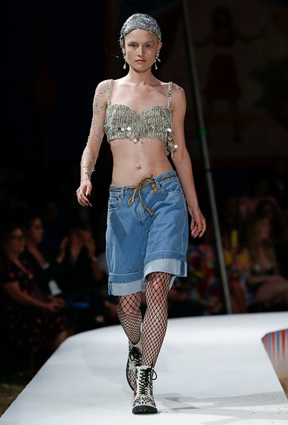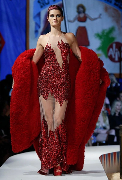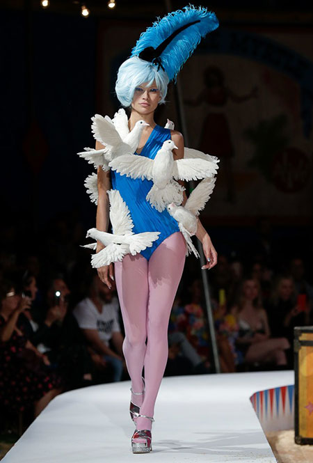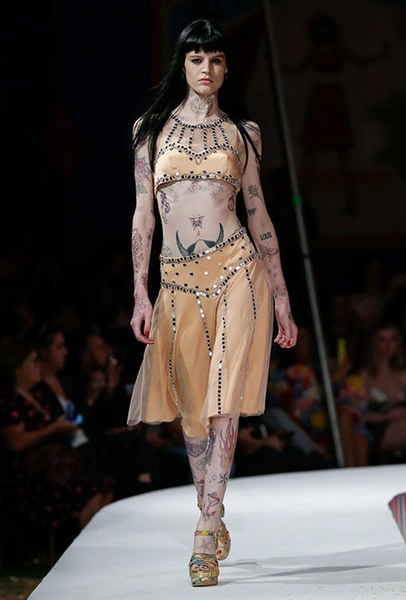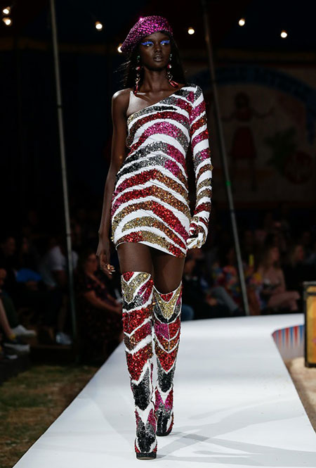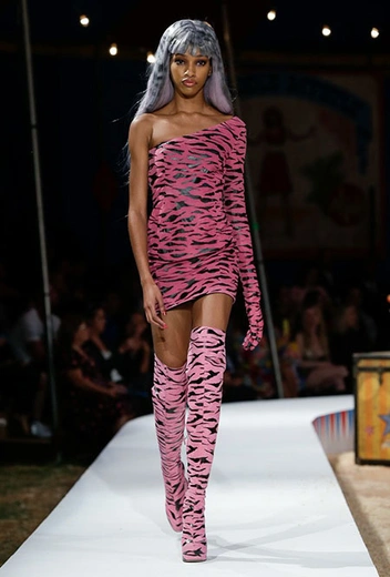 Есть даже дивы бурлеска в блестящих корсетах и полупрозрачных вечерних а платьях (одна из них даже устроила самое настоящее выступление в конце дефиле) и неизвестно каким ветром принесенные гламурные тусовщицы в розовых ботфортах до колена. Хотя выглядят эти женщины, скорее как фрики, чем как сексуальные соблазнительницы и в этом Джереми Скотт верен себе: его вещи по-прежнему не «про» секс или соблазн – для этого они чересчур гротескны.