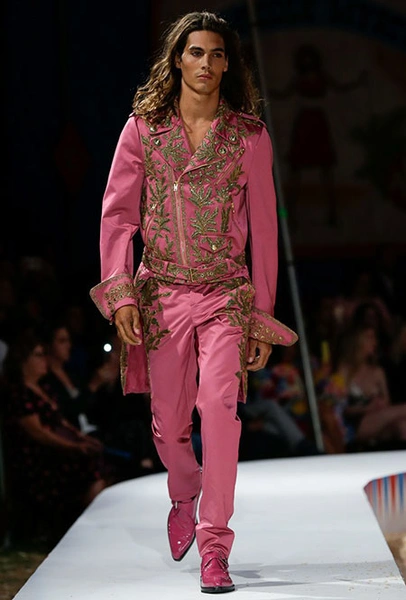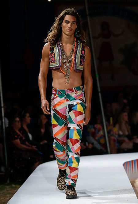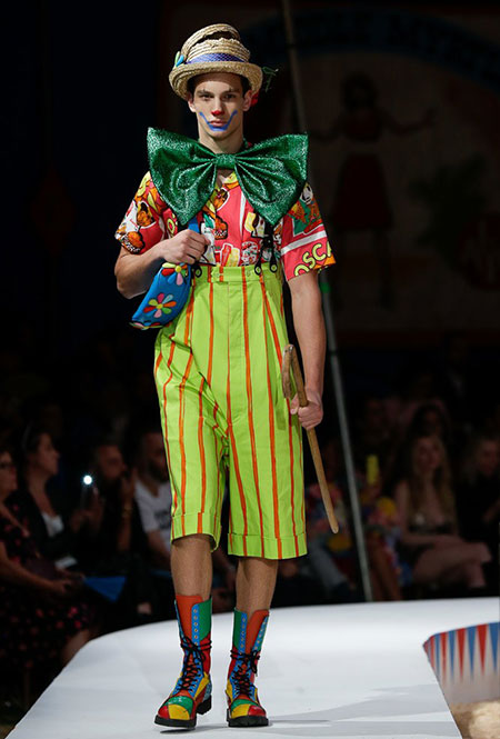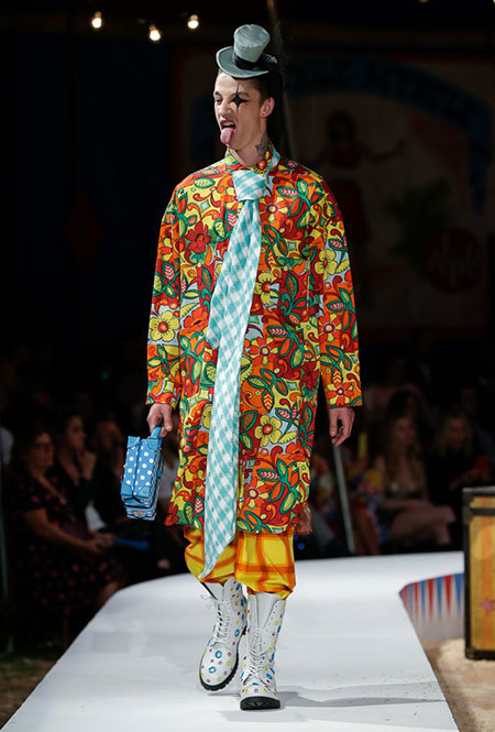 Среди женщин (а женских образов в коллекции существенно больше, хоть она и позиционируется как смешанная – menswear & womenswear) есть «кислотные» клоунессы в гигантских цветных очках, ярких колготках и платьях с фигурным подолом, расшитых крупными яркими цветами. Есть подражательницы бессмертной Грейс Джонс – леди в леопардовых комбинезонах и больших тюрбанах в тон.