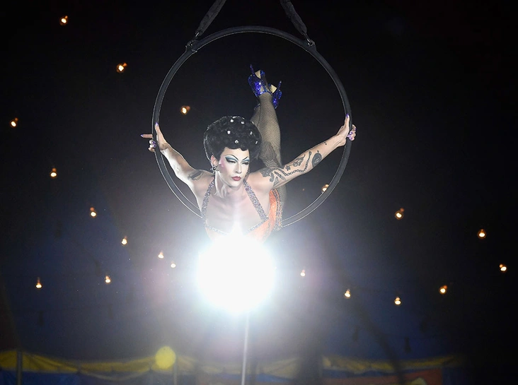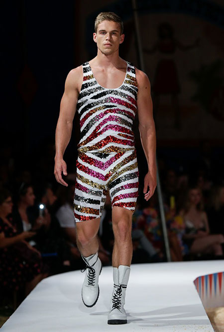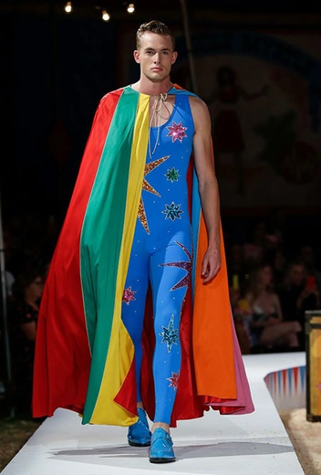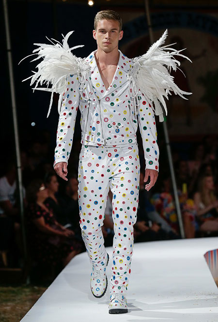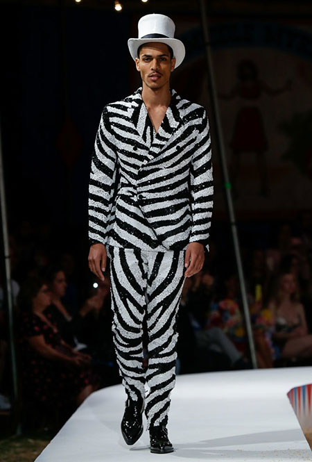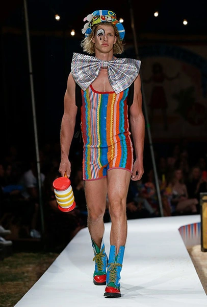 Мужчины в «цирке» Скотта носят гигантские цветные галстуки-бабочки и брючные костюмы, будто сшитые из лоскутов пестрой материи. Они выходят на арену в мундирах, цветных комбинезонах с мантиями и странных жакетах, похожих на укороченные смокинги, открывающие часть живота.