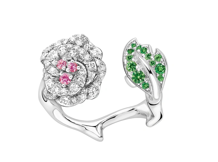 Rose Dior Bagatelle, инспирированная флорой одноименного парижского розария, пополнятся двумя незамкнутыми кольцами из белого золота: одно инкрустировано бриллиантами, а второе – бриллиантами, розовыми сапфирами и цаворитами. Помимо этого, специально для этой коллекции Виктуар де Кастеллан разработала дизайн чокера, декорированного двумя ювелирными листиками розы, на поверхности которых блистают бриллианты и зеленые гранаты.