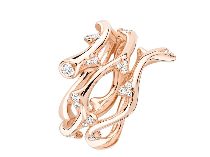 В коллекцию Bois de Rose, главным вдохновением которой вот уже много лет являются элегантные и драматичные линии розовых шипов, добавится витиеватое кольцо из желтого золота с бриллиантами.