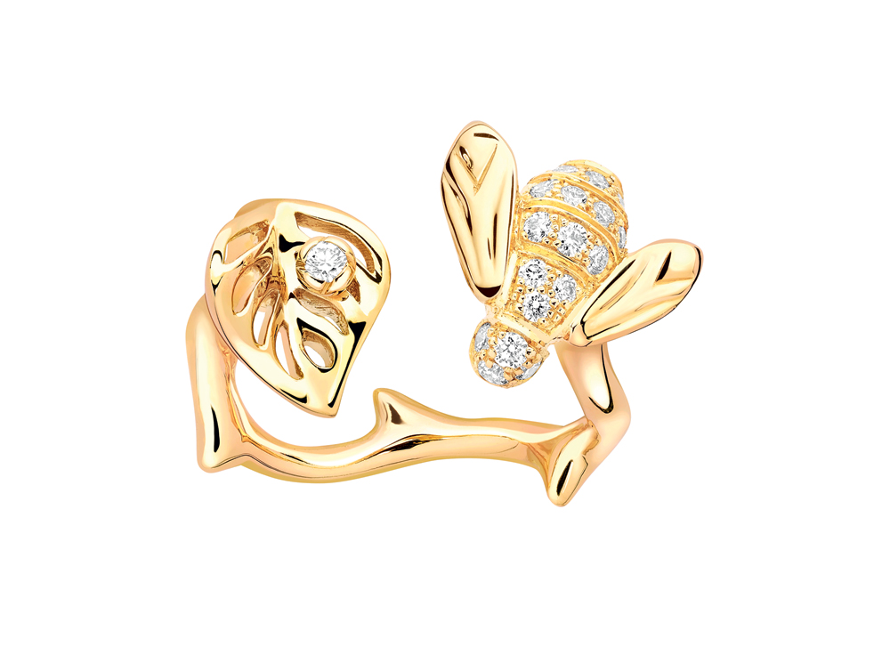 В коллекцию Bois de Rose, главным вдохновением которой вот уже много лет являются элегантные и драматичные линии розовых шипов, добавится витиеватое кольцо из желтого золота с бриллиантами.