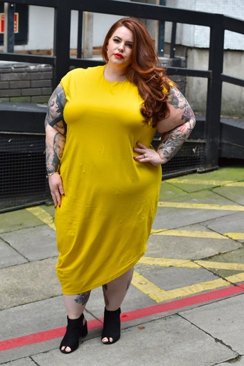 Тесс Холлидей часто критикуют за выбор нарядов: ее любовь к мини многих возмущает. Но бывают у модели и более элегантные образы, хотя и не всегда удачные. Например, желтое платье, красивое само по себе, совершенно не украшает Тесс. Неудачно подобран крой: оно свободно сидит под грудью и натягивается на животе. А короткие рукава, прикрывающие только плечи, делают руки еще массивней. Совершенно иначе Тесс выглядела бы в платье с акцентом на талии, с более длинными рукавами или вовсе без них. Заменить стоит и обувь — грубые черные босоножки визуально режут ногу (читайте также: Стройнят и делают выше: 7 самых удачных моделей вечерних платьев для девушек plus size).
