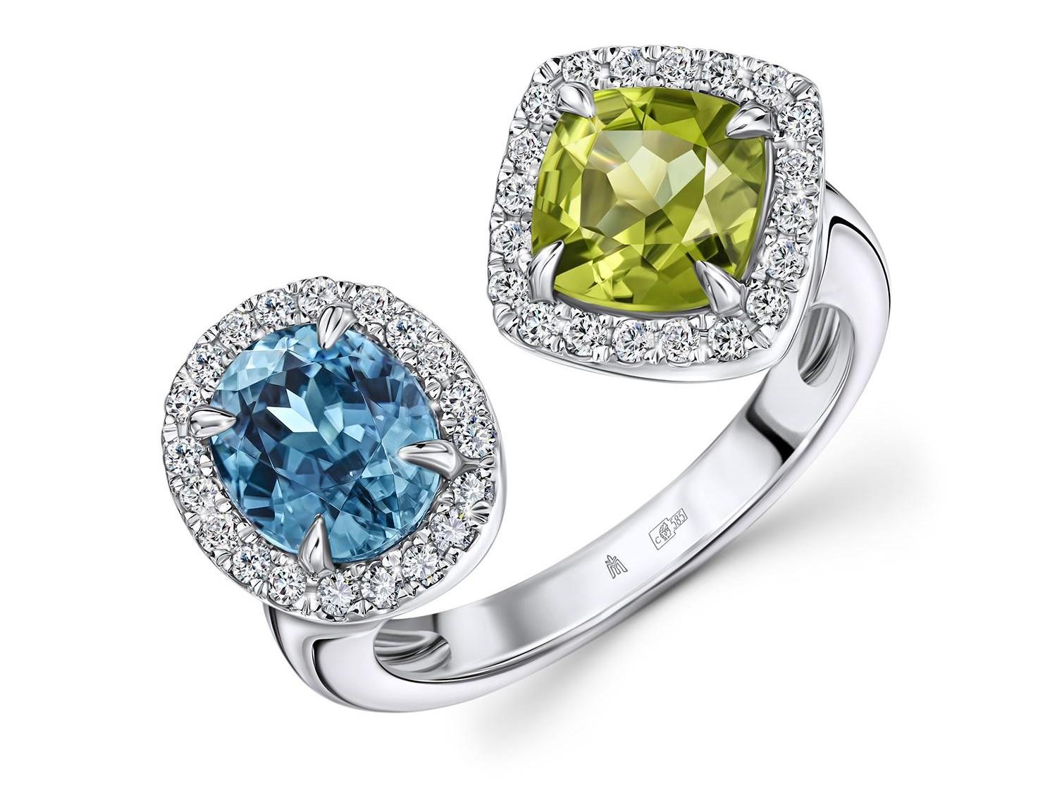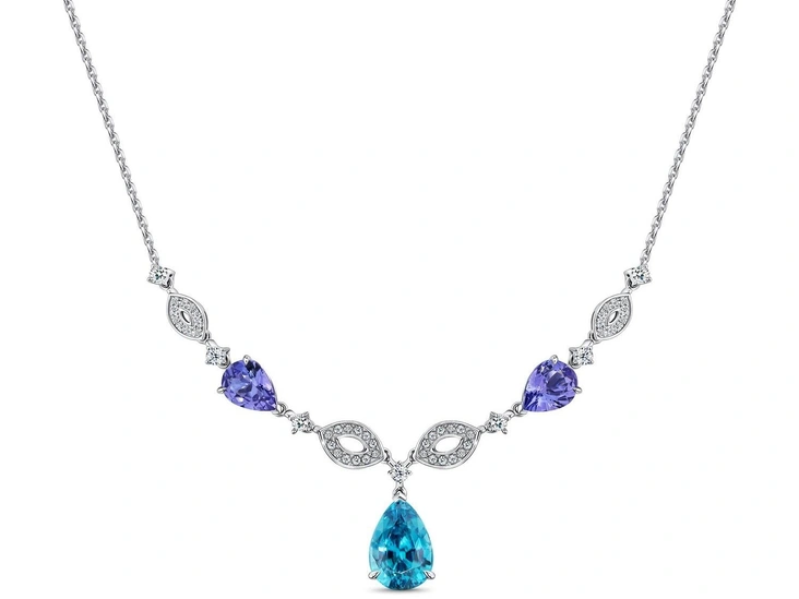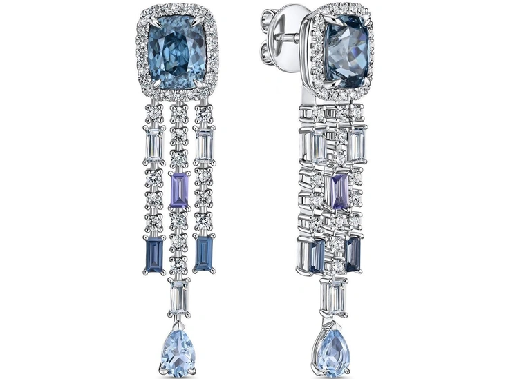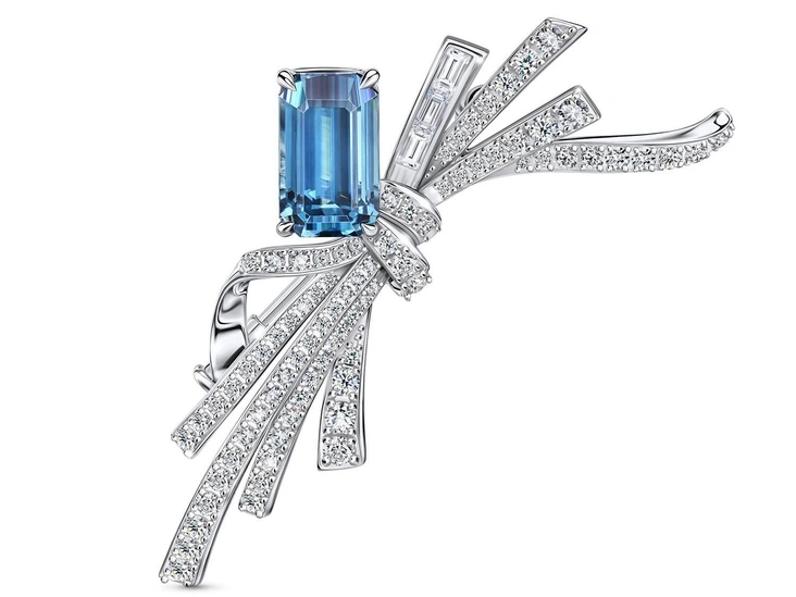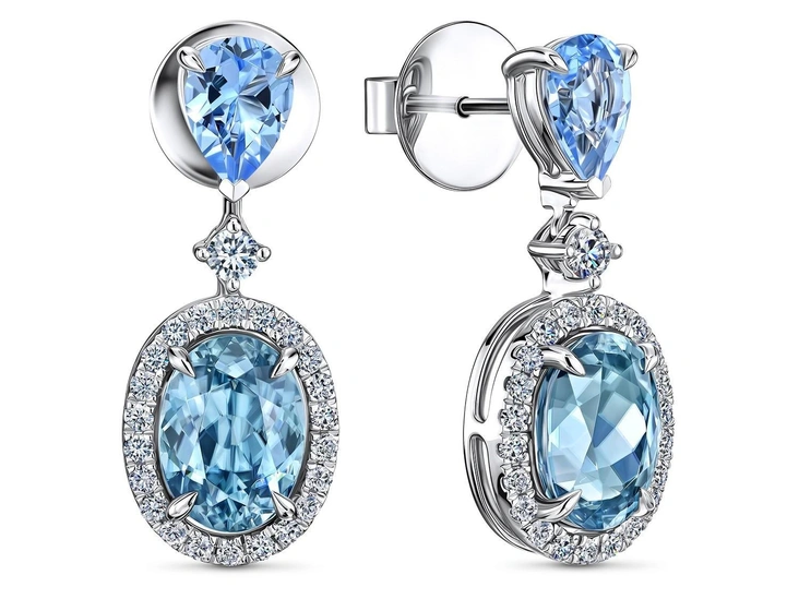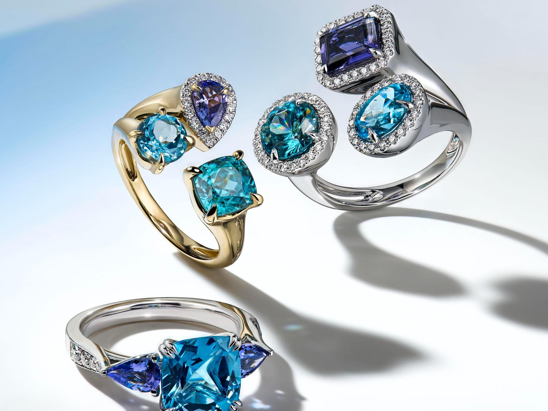 Крупные солисты коллекции — зеленовато-голубые цирконы, которые предстают в огранках «овал», «кушон», «октагон», «груша». Нашлось место и редкому загодочному иолиту, способному менять оттенок в зависимости от угла падения света. Крупные аквамарины поразят способностью имитировать отражение утреннего света на поверхности моря. Топазы благородного голубого цвета выделятся характерным сиянием. А танзаниты из коллекции Blue Lagoon вдохновят своей редкостью и трихроизмом — способностью менять цвет под разными углами освещения.