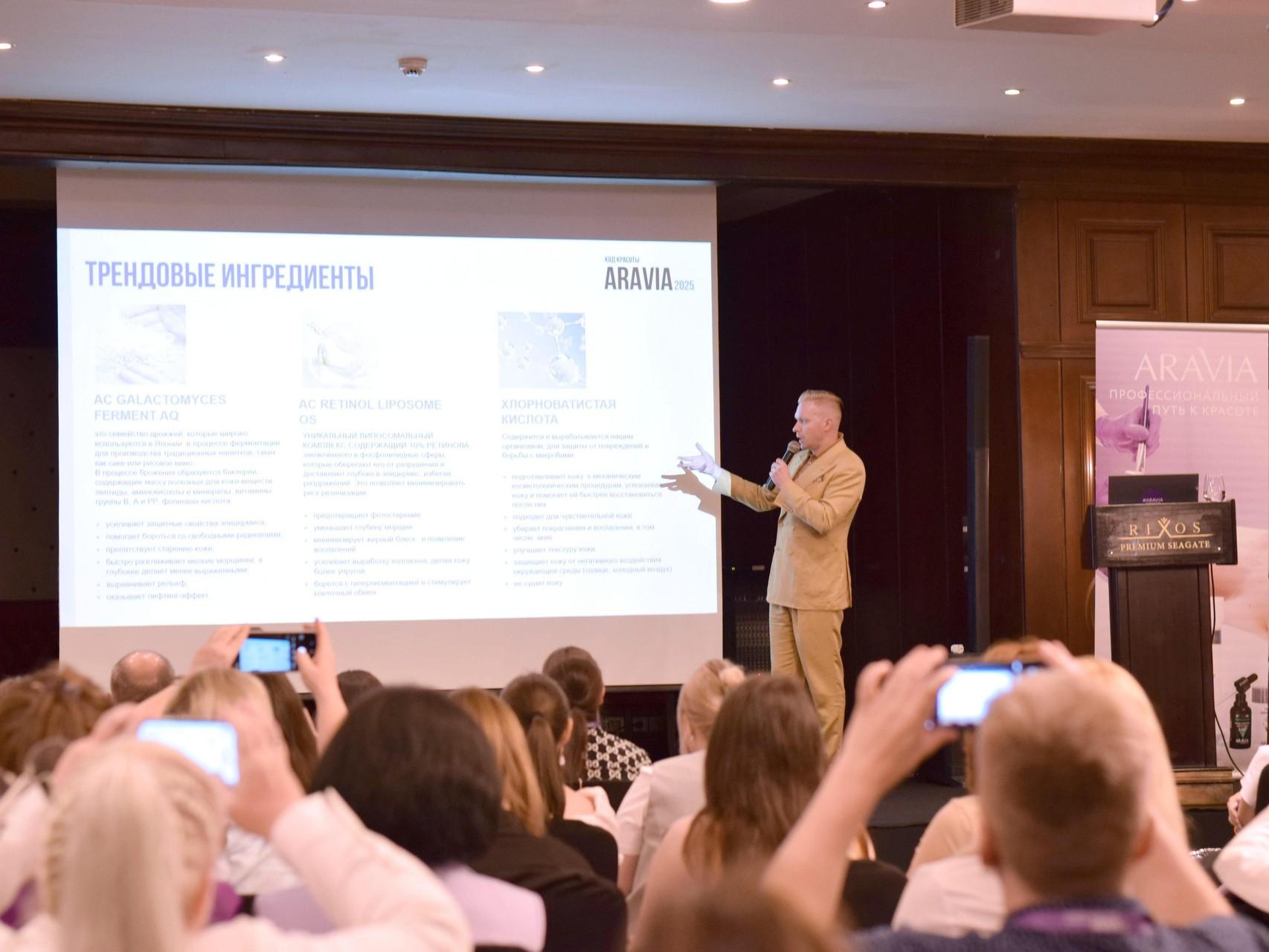 Директор технологического сервиса ARAVIA Денис Меркурьев высказался, что важно постоянное профессиональное развитие, чтобы соответствовать современным стандартам индустрии. На мероприятии коснулись современных подходов в борьбе с гиперпигментацией, обсудили значение кожного микробиома и внедрение инновационных компонентов в составы косметических средств.