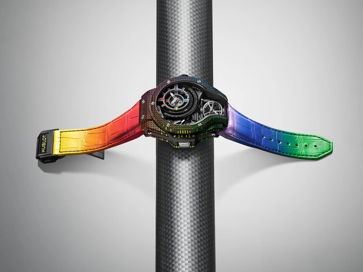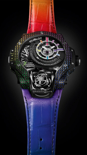 Швейцарский производитель часов Hublot снова превзошел сам себя, внедрив в создание аксессуаров современные технологии, которые ранее не использовались мастерами. Премиальный бренд эксклюзивно представил на мероприятии Hublot Loves Art в Майями модель MP-09 Tourbillon Bi-Axis 5-Day Power Reserve, в которой воспроизвел знаменитый дизайн Rainbow.