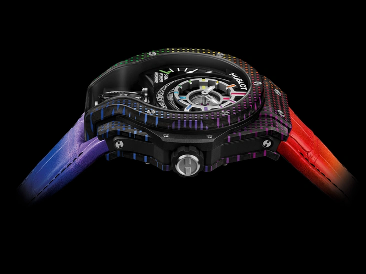 Обладая мощнейшим часовым и промышленным оборудованием, а также изобретательностью своих исследователей, компания Hublot преодолела все сложности на пути создания уникальной модели. Тонкие бруски углерода укладываются бок о бок, после чего бруски цветного композита помещаются вертикально в зазоры и слегка выступают из карбона. Эта разница в высоте заполняется третьей углеродной сеткой, которая поднимает все компоненты на один уровень.